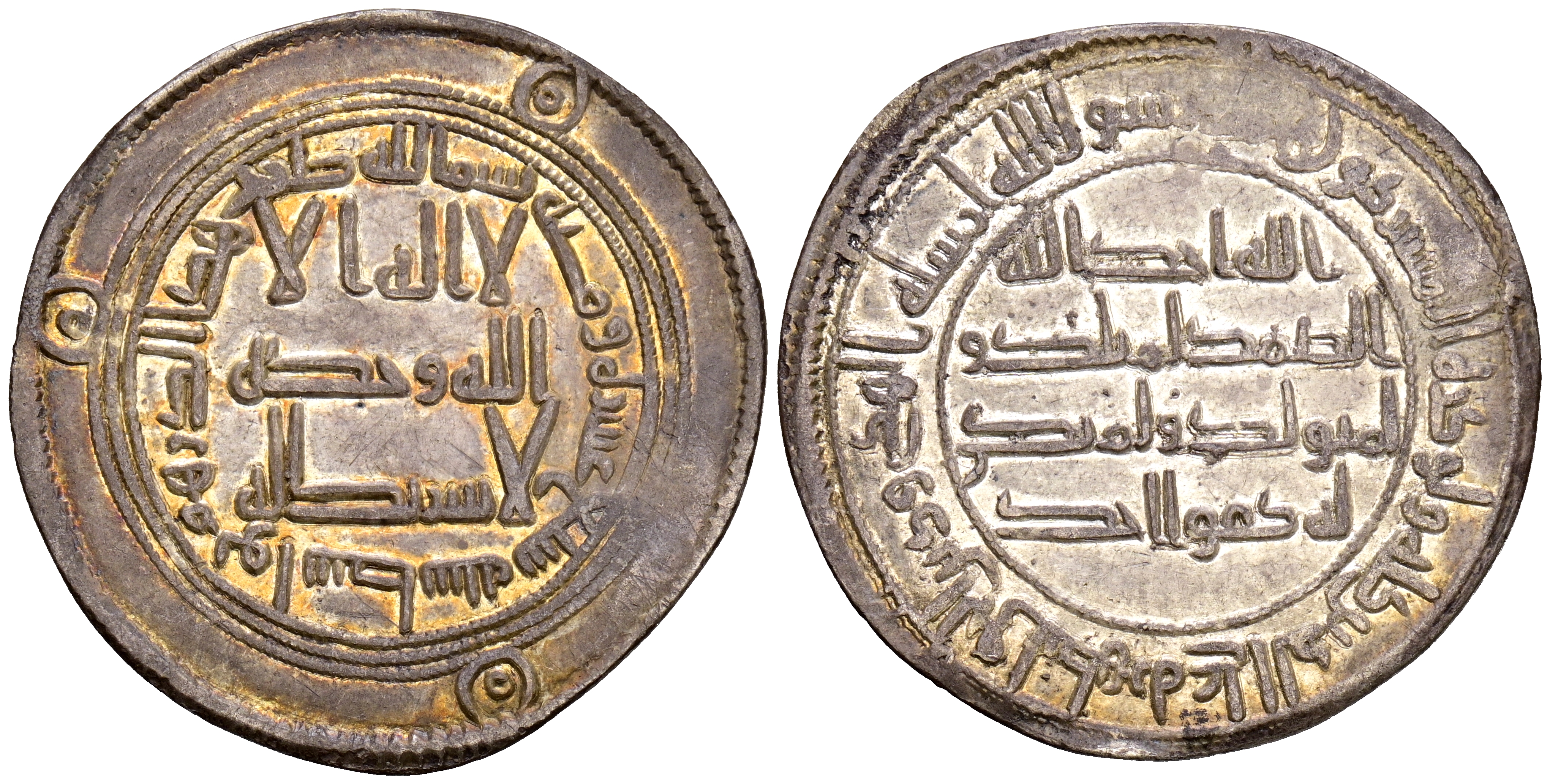 CALIFATO OMEYA DE DAMASCO, Hisham Ibn Abd al-Malik. Dirham. (Ar. 2,88g/27mm). 117H. Wasit / واسط. (Álbum 137; Klat 710). EBC-. Precioso tono de monetario en anverso y restos de brillo original en reverso.