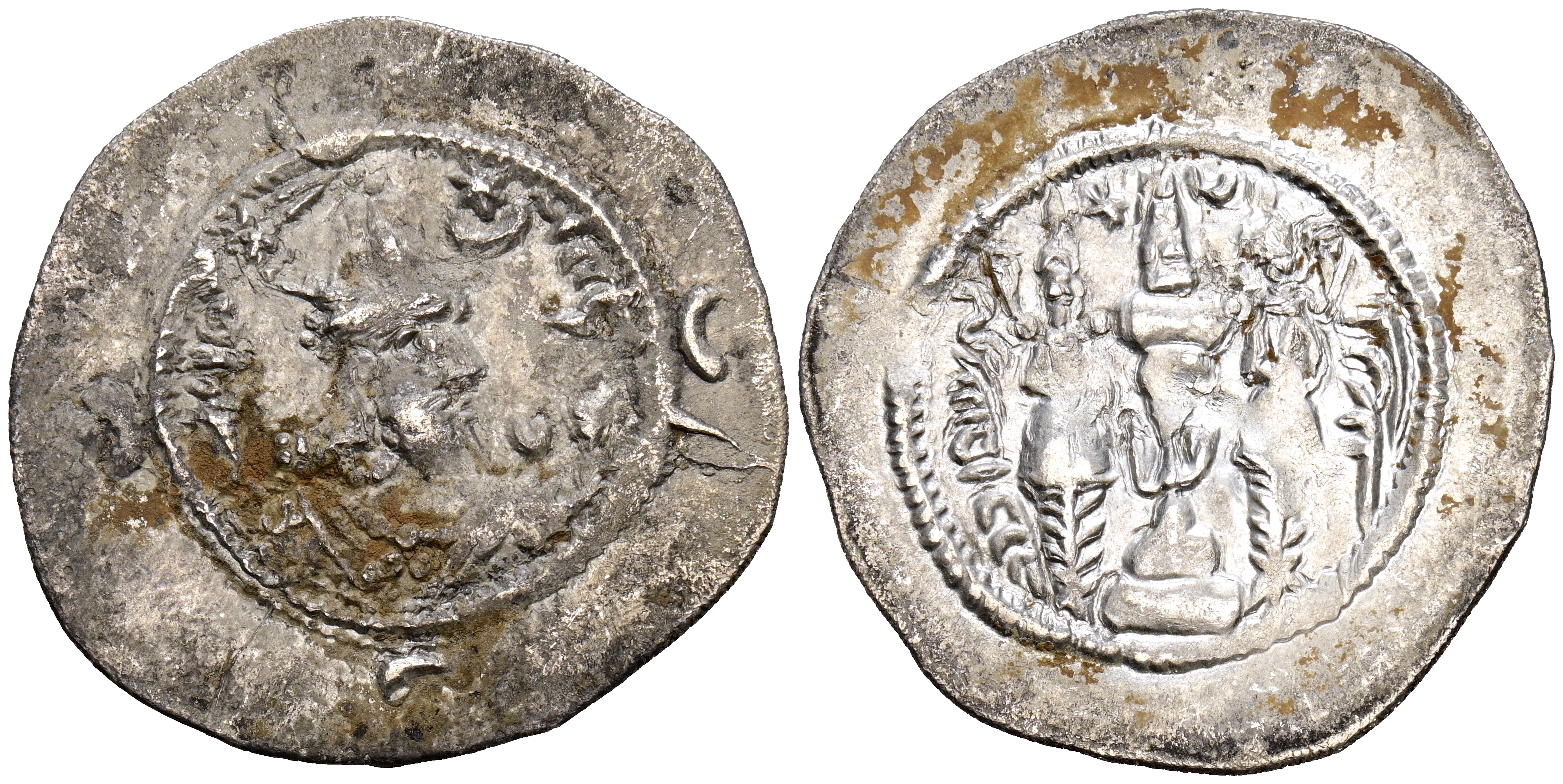 IMPERIO SASANIDA, Khusro I. Dracma. (Ar. 4,02g/30mm). Año 28 de reinado/558 d.C. BYSh (Bishapur). (Göbl-SN II/2). Anv: Busto coronado y drapeado de Khusro I a derecha, alrededor leyenda en palavhi: a la derecha, ABZUD (Crecimiento) y a la izquierda, GDH (Explendor) todo dentro de gráfila circular. En el exterior, a las 3h, 6h y 9h, creciente. Rev: Altar de fuego flanqueado por dos sacerdotes, a la derecha ceca: BYSh, y a izquierda año de acuñación: 28, todo dentro de gráfila circular. MBC.