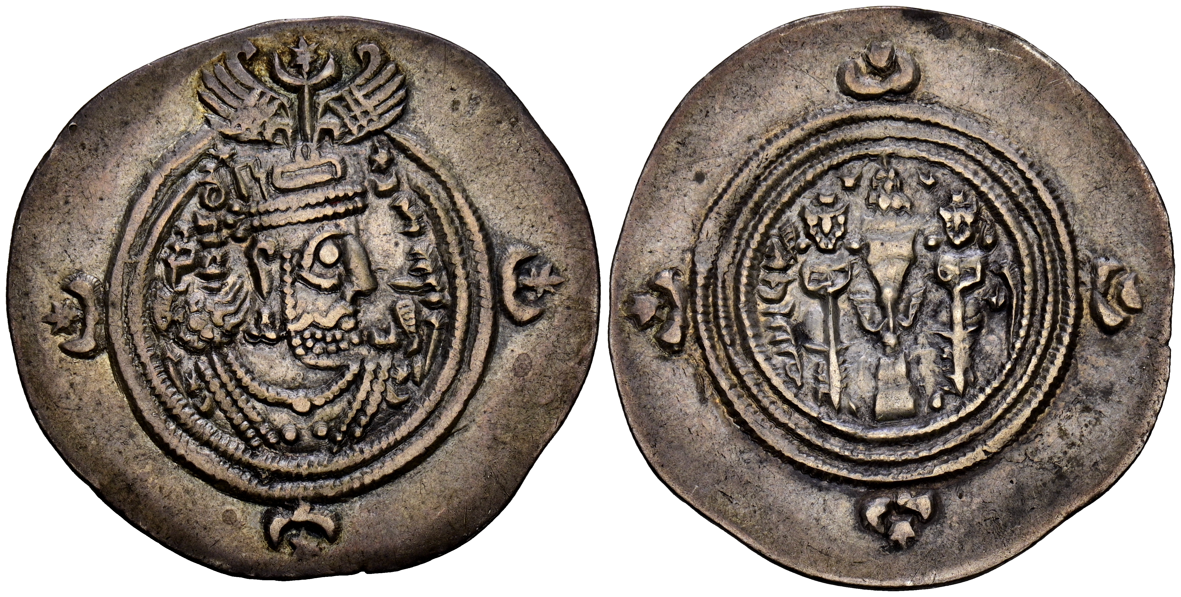 IMPERIO SASANIDA, Khusro II. Dracma. (Ar. 4,06g/32mm). Año 35 PYE/624-5 d.C. DA (Darabgird). (Göbl-II/3). Anv: Busto coronado y drapeado de Khusro II a derecha, alrededor leyenda en palavhi: a la derecha, ABZUD (Crecimiento) y a la izquierda, GDH (Explendor) todo dentro de una doble gráfila circular. En el exterior, a las 3h, 6h y 9h, creciente y estrella. Rev: Altar de fuego flanqueado por dos sacerdotes, a la derecha ceca: WYHC, y a izquierda año de acuñación: 35 (Post Yazgard Era) dentro de 3 orlas, en el exterior, a las 12h, 3h, 6h y 9h creciente y estrella. MBC+. Atractivo ejemplar.