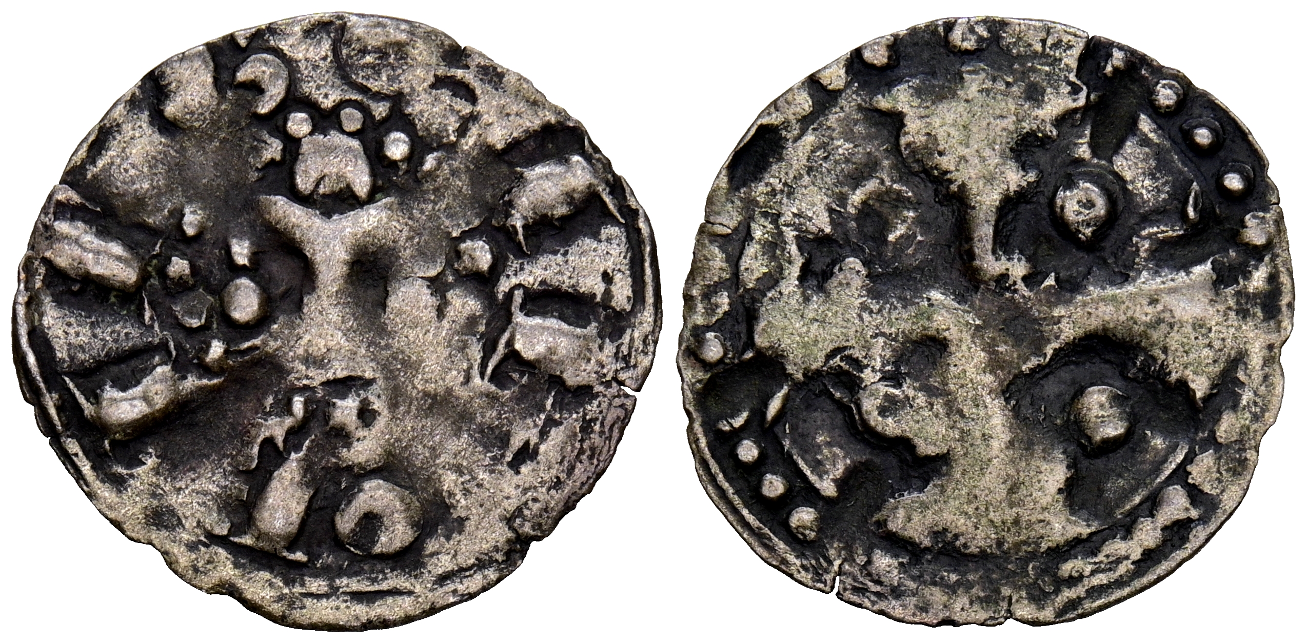 RAMON BERENGUER IV (1131-1162). Comensal. (Ve. 0,56g/18mm). Condado de Barcelona. (Cru C.G. 1846; Cru V.S. 33). Anv: Lirio dentro de grafila circular de puntos, alrededor leyenda retrograda: BARCINO. Rev: Cruz patada con anillos en los cuarteles rodeada de gráfila de puntos. MBC. Escasa.