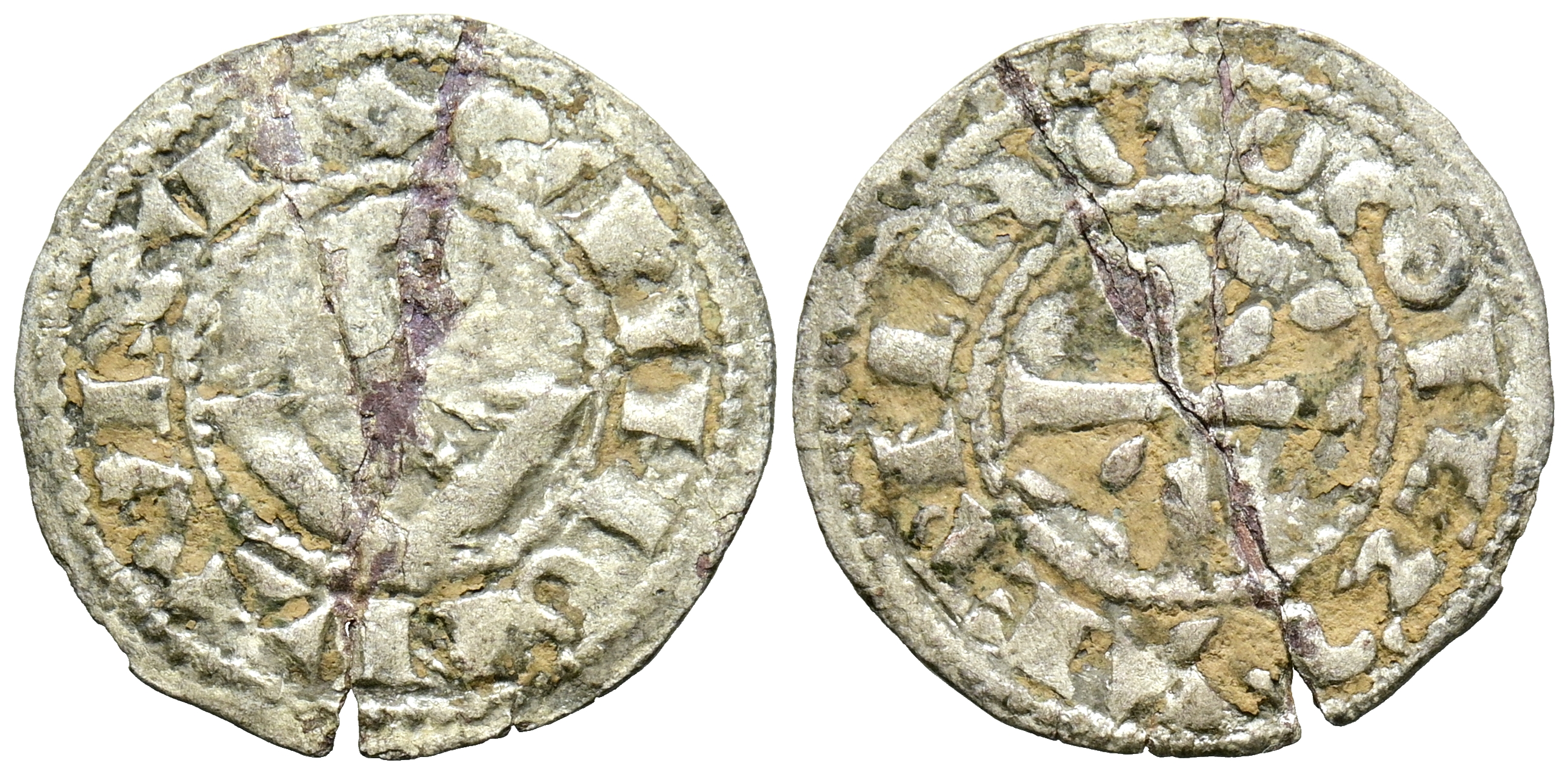 ERMENGOL VIII (1184-1209). Dinero. (Ve. 0,80g/18mm). Agramunt (Condado de Urgell). (Cru C.G. 1935). Anv: Báculo sobre V de fondo plano. GRIMONT VRGL. Rev: Cruz con trébol en el 2º y 3º cuartel, alrededor leyenda: ERMENGO COME. MBC-. Marca de doblez. Muy rara.