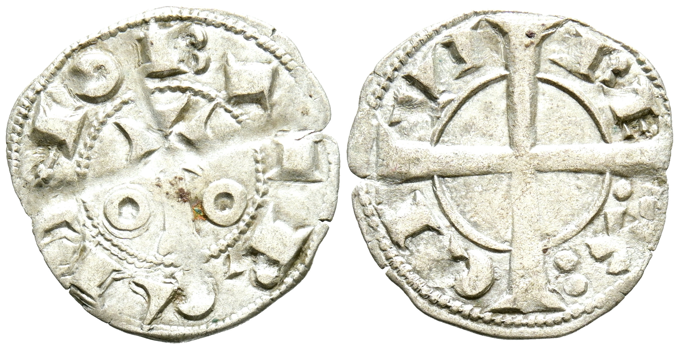 ALFONSO I (1162-1196). Dinero. (Ve. 0,91g/19mm). Barcelona. (Cru.V.S. 296, primera emisión). Anv: Cruz sobre palo entre añillos dentro de gráfila, alrededor leyenda: BARQINO. Rev: Cruz, alrededor leyenda: CIVI REX. MBC+.