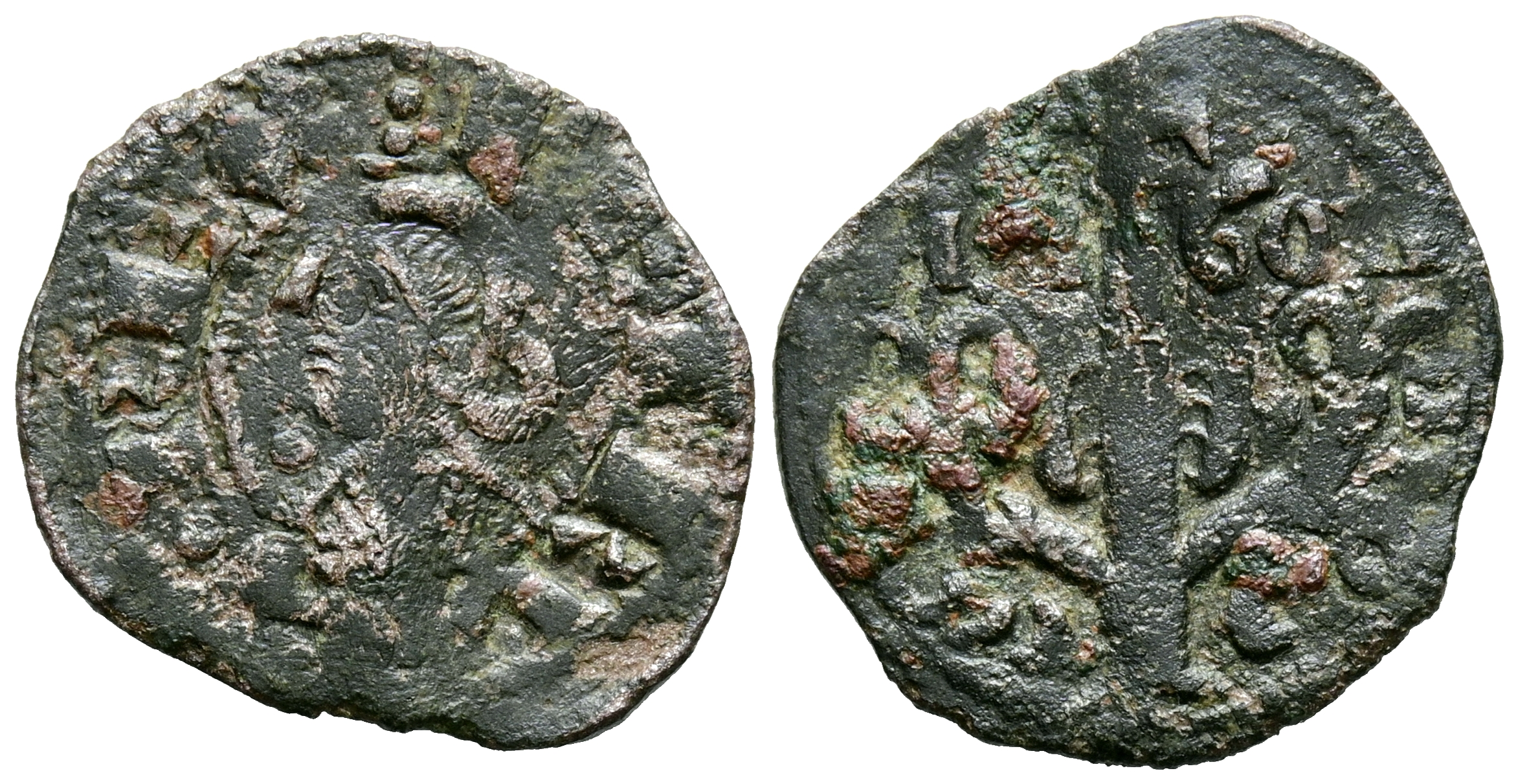 PEDRO EL DE HUESCA (1094-1104). Dinero. (Ve. 0,73g/17mm). Jaca (Huesca). (Crus V.S. 213). Anv: Busto de Pedro a izquierda, alrededor leyenda: PETRVS REX. Rev: Árbol superado de cruz, a los lados leyenda: ARA-GON. MBC-. Oxidaciones. Muy escasa.