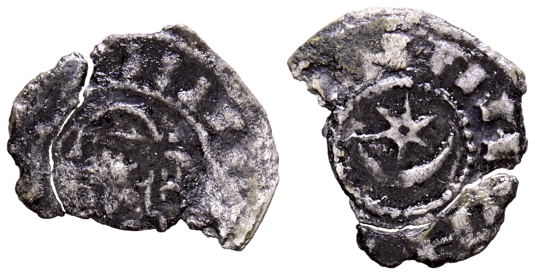 SANCHO EL FUERTE (1194-1234). Óbolo. (Ve. 0,23g/13mm). Navarra. (Cru V.S. 225). Anv: Cabeza de Sancho el Fuerte, alrededor leyenda: SANCIVS REX. Rev: Creciente y estrella, alrededor leyenda: NAVARRE. BC. Cospel faltado. Escasa.