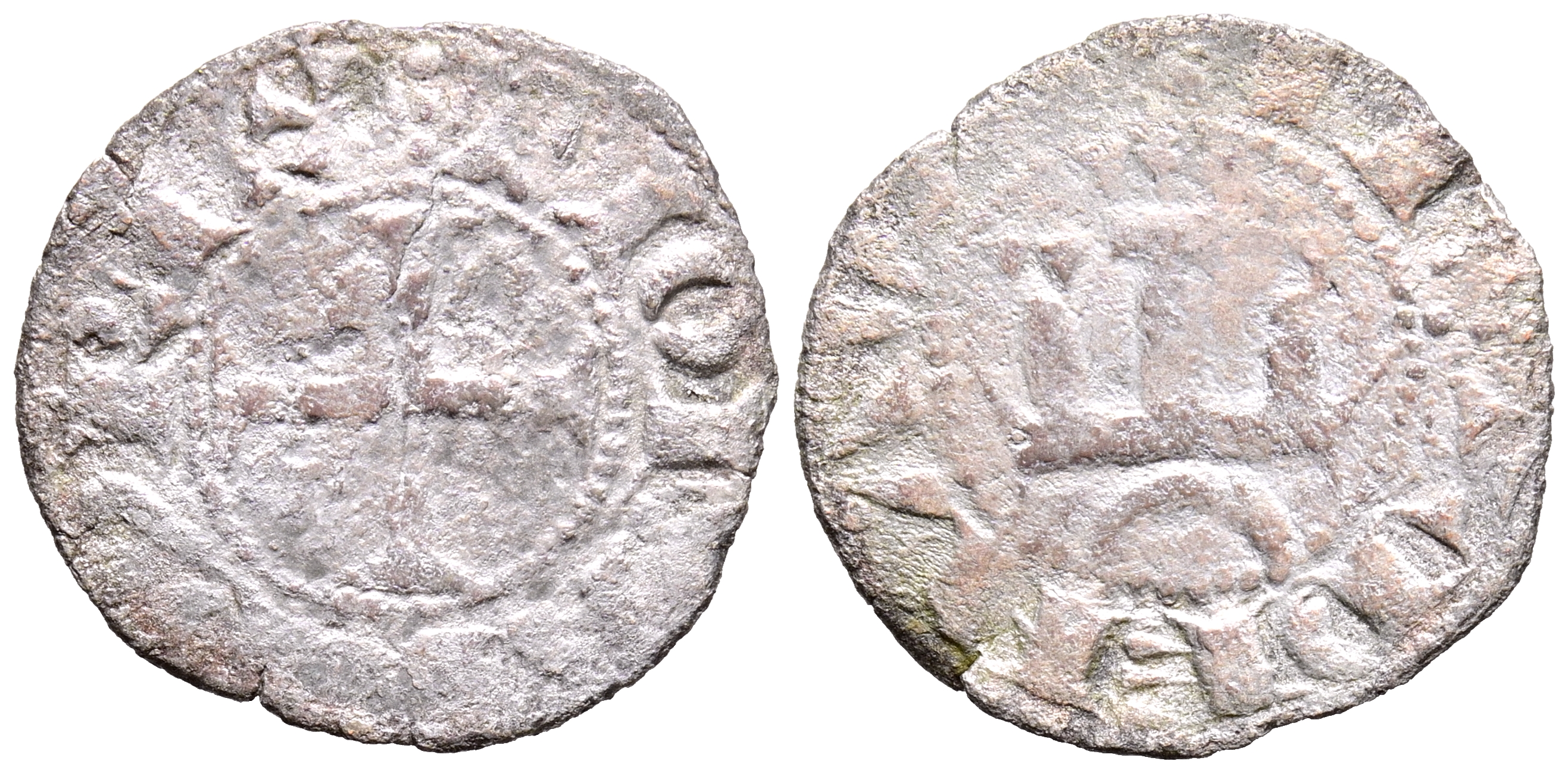 TEOBALDO II (1125-1152). Dinero. (Ar. 0,75g/18mm). Navarra. (Cru V.S. 228). Anv: Cruz patada, alrededor leyenda: TIOBALD' REX. Rev: Castillo esquemático, debajo creciente, todo dentro de gráfila circular, alrededor leyenda: DE NAVARIE. BC-/BC+.