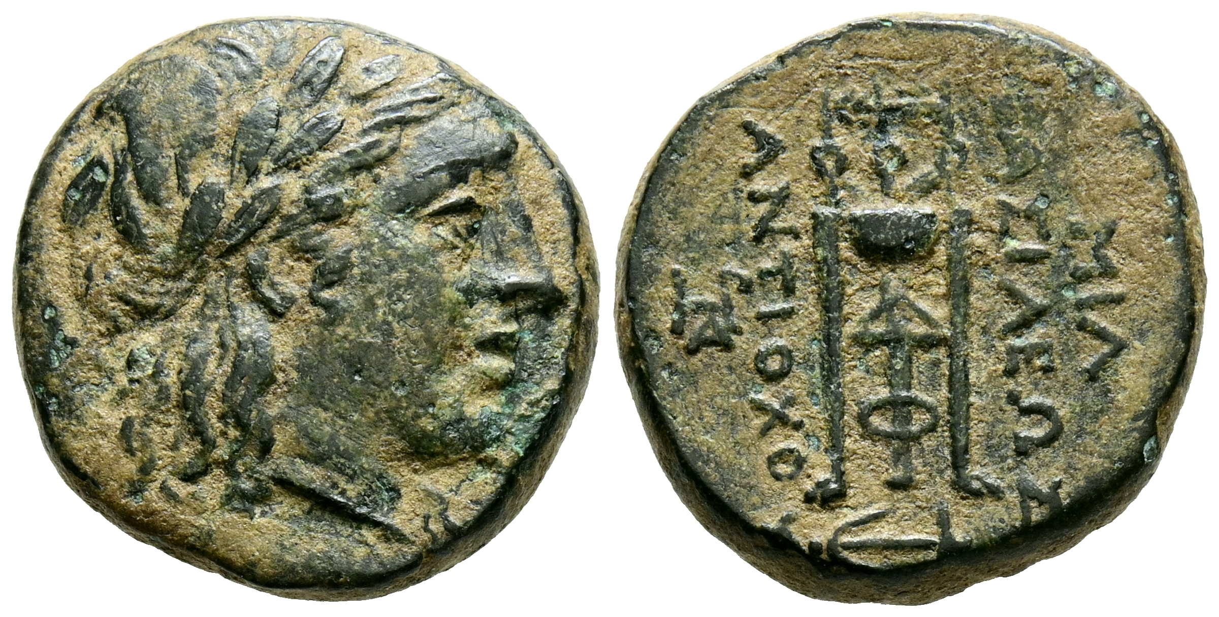 IMPERIO SELEUCIDA, Antiocos II Theos. AE17. (Ae. 4,74g/17mm). 261-246 a.C. Sardes. (HGC 9, 253; Seaby 525). Anv: Cabeza laureada de Apolo a derecha. Rev: Trípode, en campo monograma, debajo ancla, alrededor leyenda griega: ΒΑΣΙΛΕΩΣ-ΑΝΤΙΟΧOΥ. MBC.