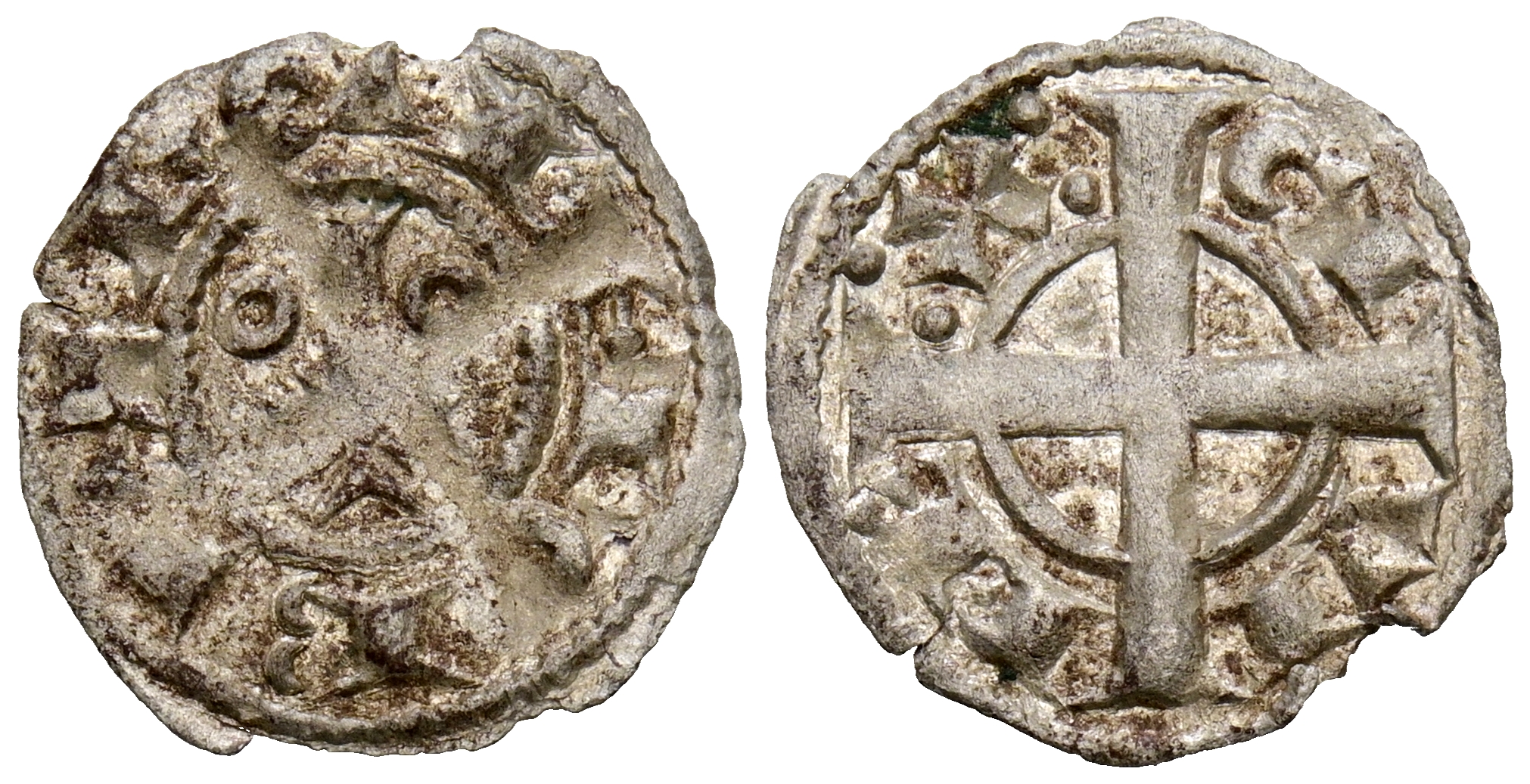 ALFONSO II (1162-1196). Óbolo. (Ve. 0,35g/15mm). Barcelona. (Cru V.S. 297, como Alfonso I). Anv: Cruz sobre palo entre añillos dentro de gráfila, alrededor leyenda: BARQINO. Rev: Cruz, alrededor leyenda: CIVI REX. EBC-. Restos brillo original.