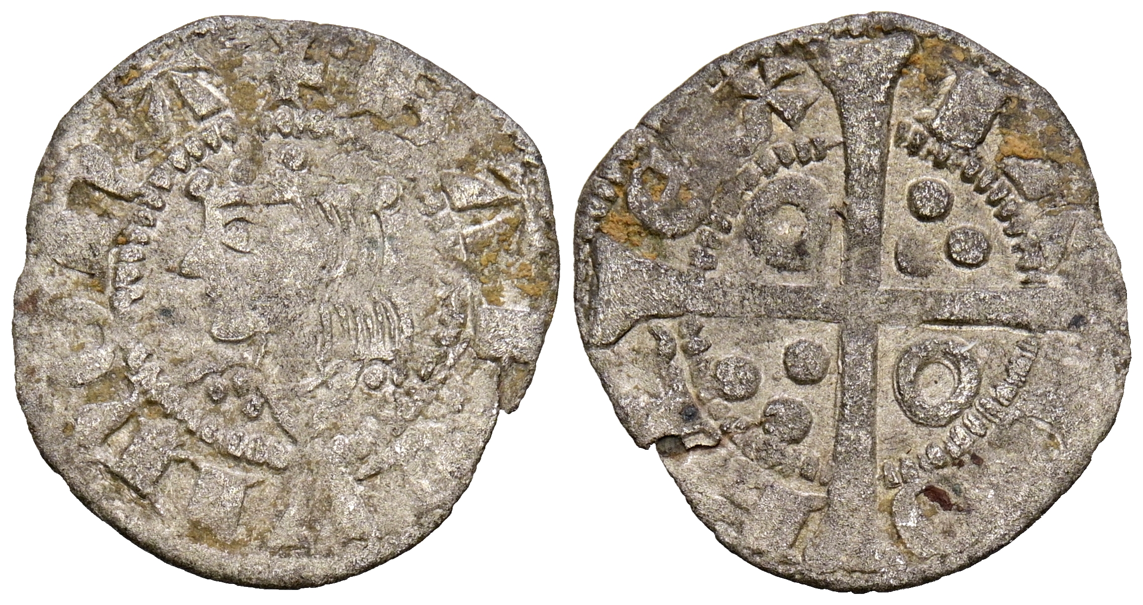 JAIME II (1291-1327). Dinero. (Ve. 0,75g/16mm). Barcelona. (Cru.V.S. 340). Anv: Busto coronado de Jaime I a izquierda, alrededor leyenda: BARQVINO. Rev: Cruz dentro de gráfila, en el 1º y 4º cuadrante tres puntos, en el 2º y 3º cuadrante roeles, alrededor leyenda: IACOB REX. MBC-.