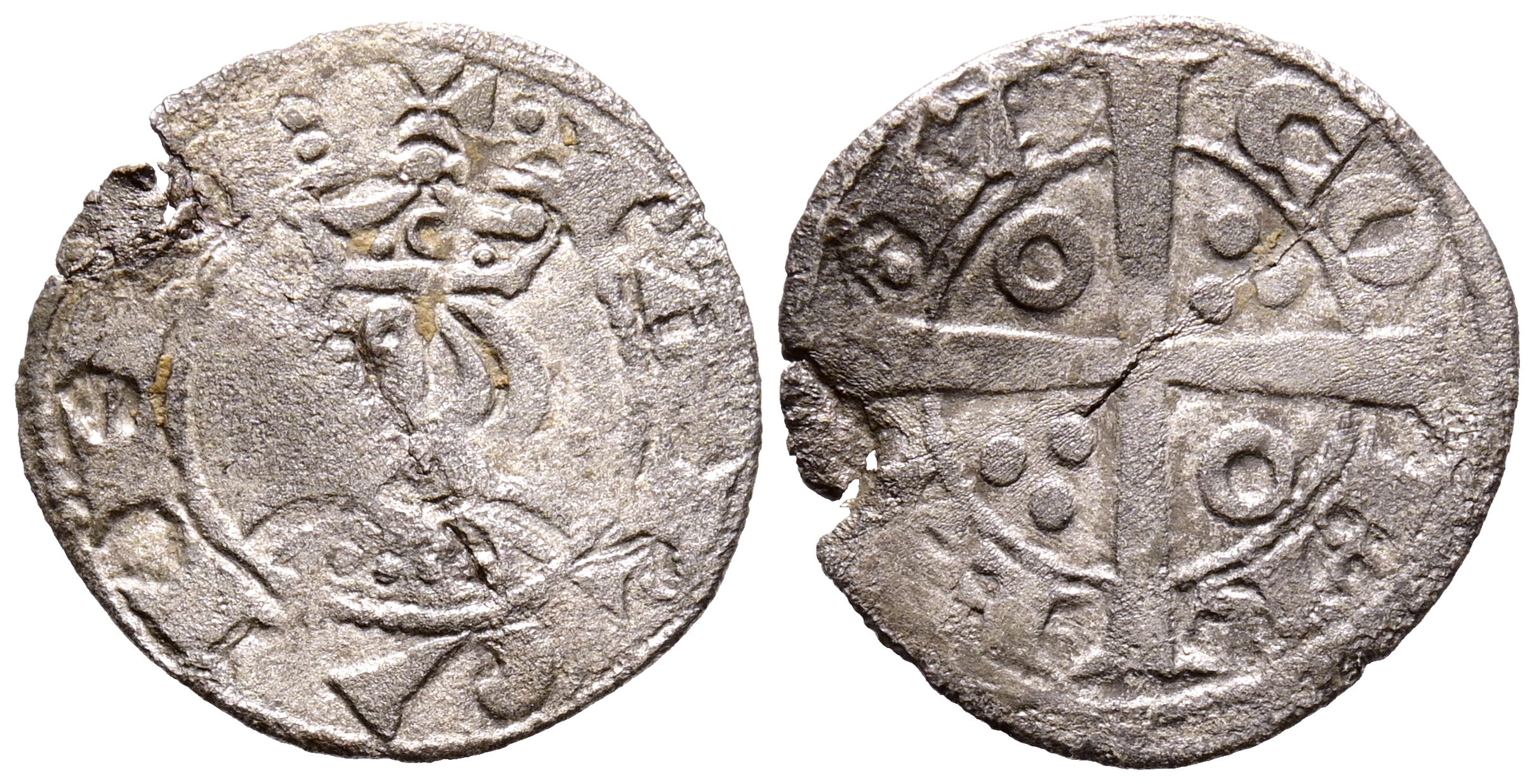 JAIME I (1213-1276). Dinero. (Ve. 0,75g/17mm). Barcelona. (Cru.V.S. 308). Anv: Busto coronado de Jaime I a izquierda, alrededor leyenda: BARQVINO. Rev: Cruz dentro de gráfila, en el 1º y 4º cuadrante roeles, en el 2º y 3º cuadrante tres puntos, alrededor leyenda: IACOB REX. MBC.