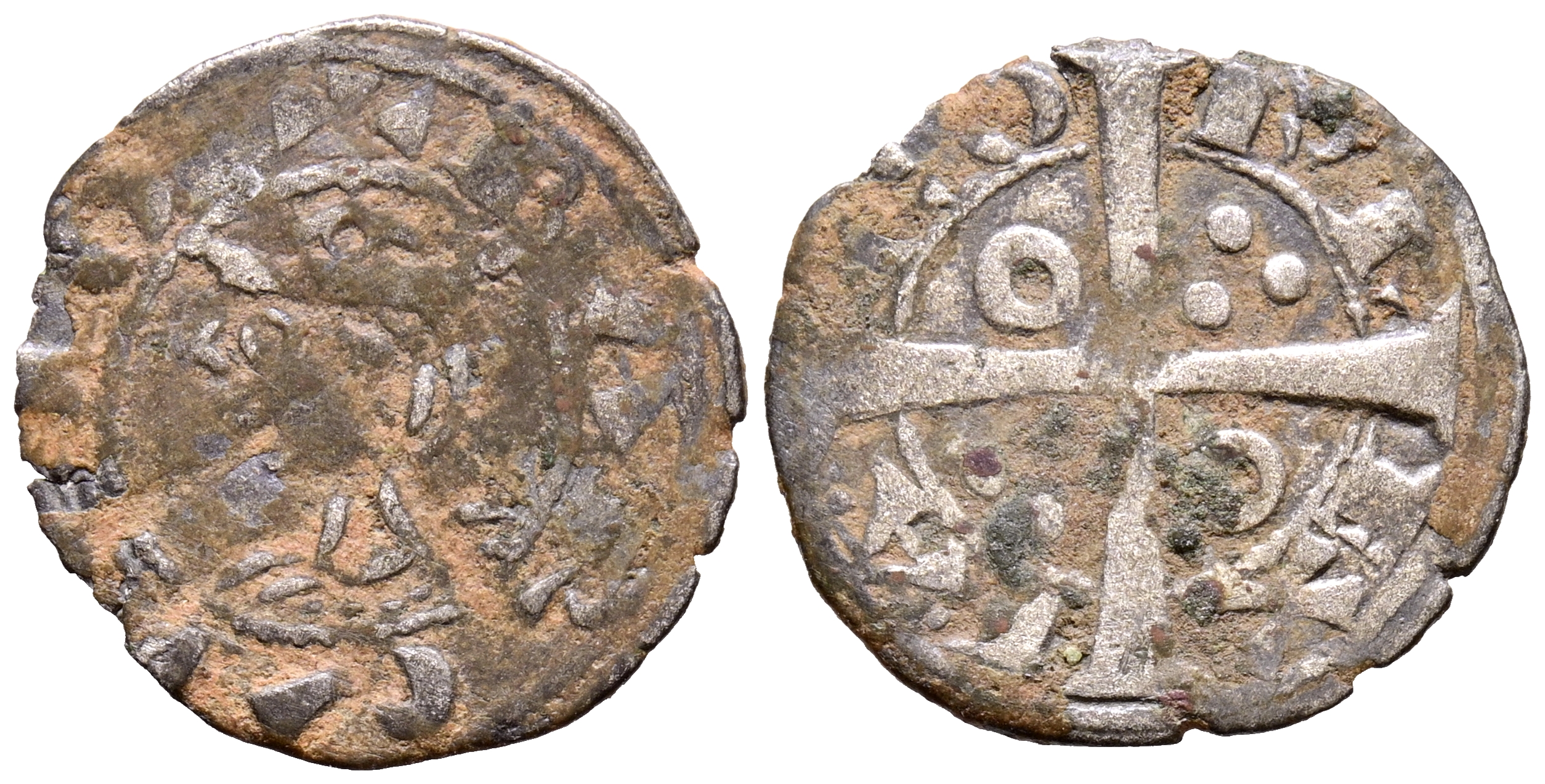 JAIME I (1213-1276). Dinero. (Ve. 0,75g/17mm). Barcelona. (Cru.V.S. 308). Anv: Busto coronado de Jaime I a izquierda, alrededor leyenda: BARQVINO. Rev: Cruz dentro de gráfila, en el 1º y 4º cuadrante roeles, en el 2º y 3º cuadrante tres puntos, alrededor leyenda: IACOB REX. MBC.