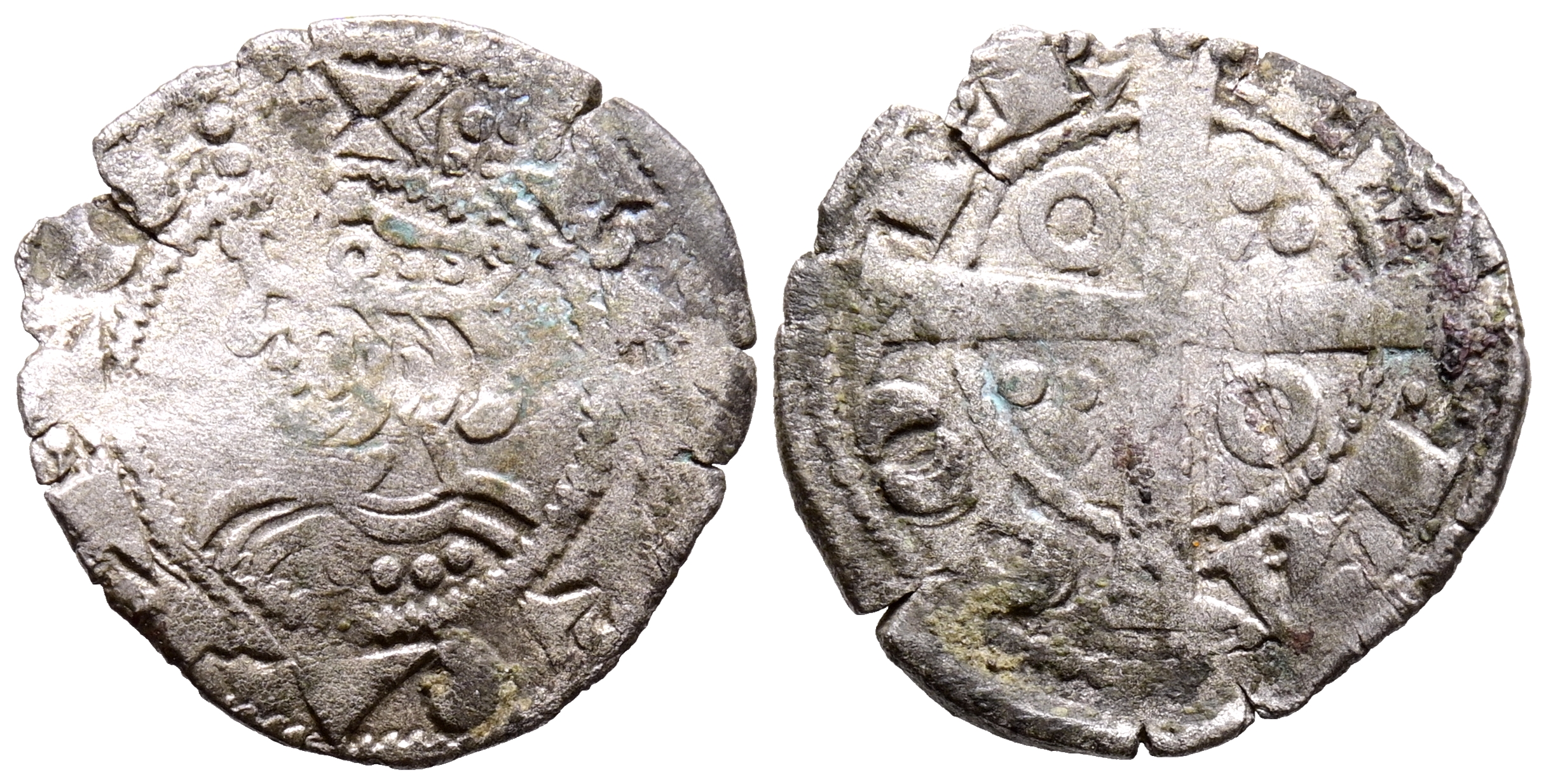 JAIME I (1213-1276). Dinero. (Ve. 0,86g/16mm). Barcelona. (Cru.V.S. 308). Anv: Busto coronado de Jaime I a izquierda, alrededor leyenda: BARQVINO. Rev: Cruz dentro de gráfila, en el 1º y 4º cuadrante roeles, en el 2º y 3º cuadrante tres puntos, alrededor leyenda: IACOB REX. MBC.