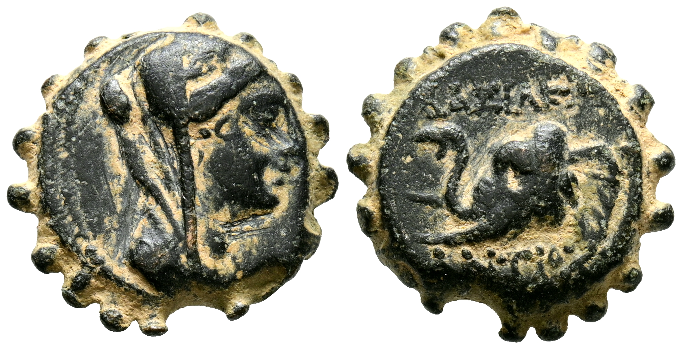 REINO SELEUCIDA, Antíoco IV Epífanes. Ae16. (Ae. 3,90g/16mm). 175-164 a.C. Antioquía. (Seaby 1407). Anv: Busto diademado, velado y drapeado de Laodiceo IV a derecha. Rev: Cabeza de elefante a izquierda, encima y debajo leyendas: ΒΑΣΙΛΕΩΣ/ΑΝΤΙΟΧΟΥ. MB C.