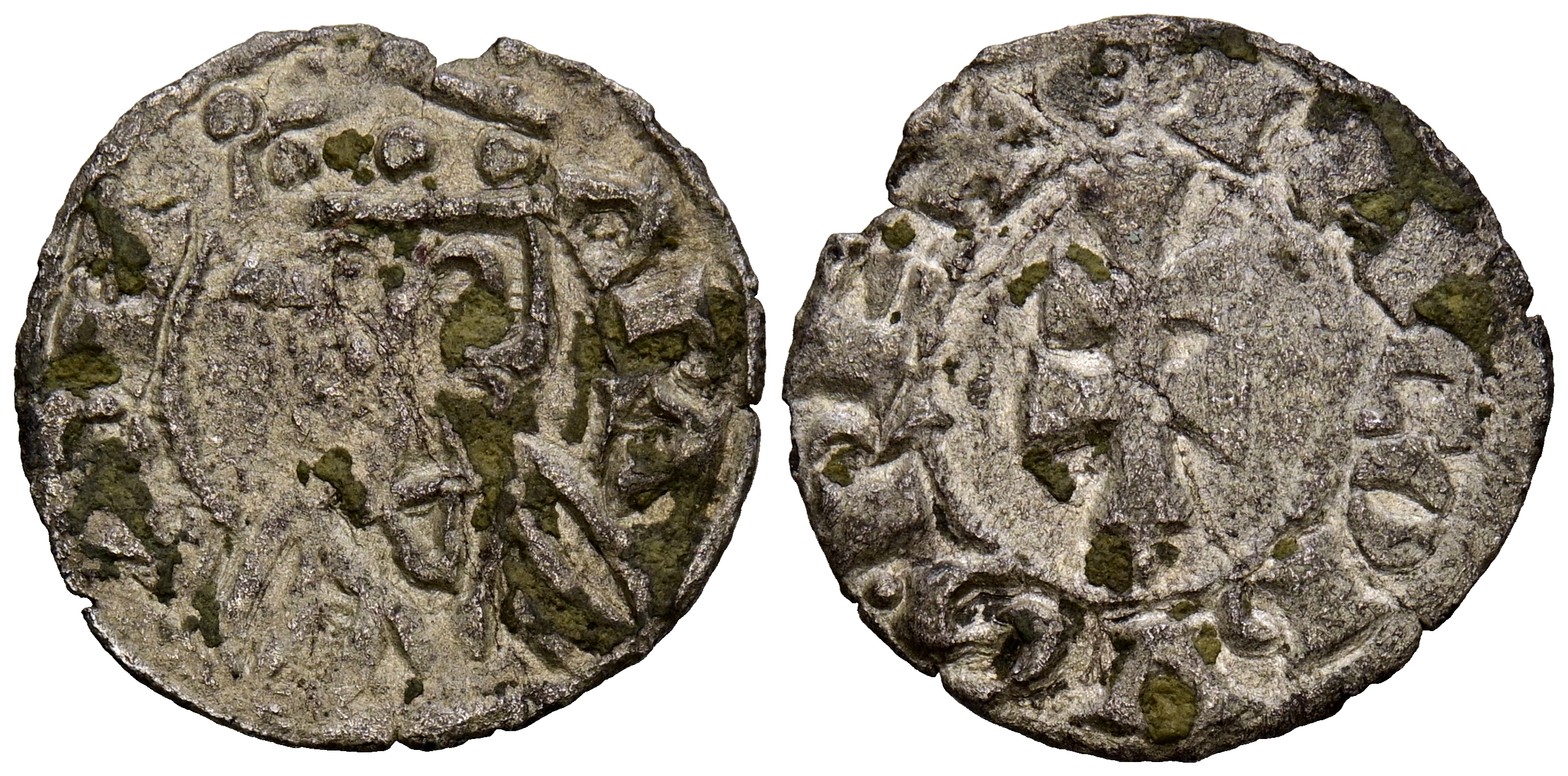 JAIME I (1213-1276). Dinero. (Ve. 0,80g/18mm). Aragón. (Cru. V.S. 318). Anv: Efigie coronada a izquierda, alrededor leyenda: ARAGON. Rev: Cruz patriarcal, alrededor leyenda: IACOBVS REX. MBC.