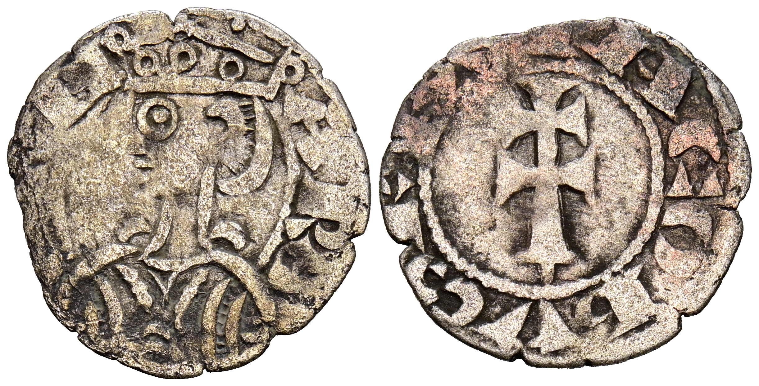 JAIME I (1213-1276). Dinero. (Ve. 0,69g/17mm). Aragón. (Cru.V.S. 318). Anv: Efigie coronada a izquierda, alrededor leyenda: ARAGON. Rev: Cruz patriarcal, alrededor leyenda: IACOBVS REX. MBC.