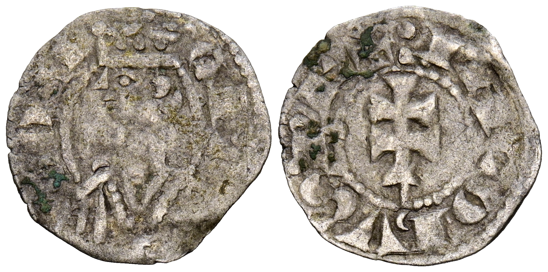 JAIME I (1213-1276). Óbolo. (Ve. 0,42g/15mm). Aragón. (Cru V.S 319). Anv: Efigie coronada a izquierda, alrededor leyenda: ARAGON. Rev: Cruz patriarcal, alrededor leyenda: IACOBVS REX. MBC-.
