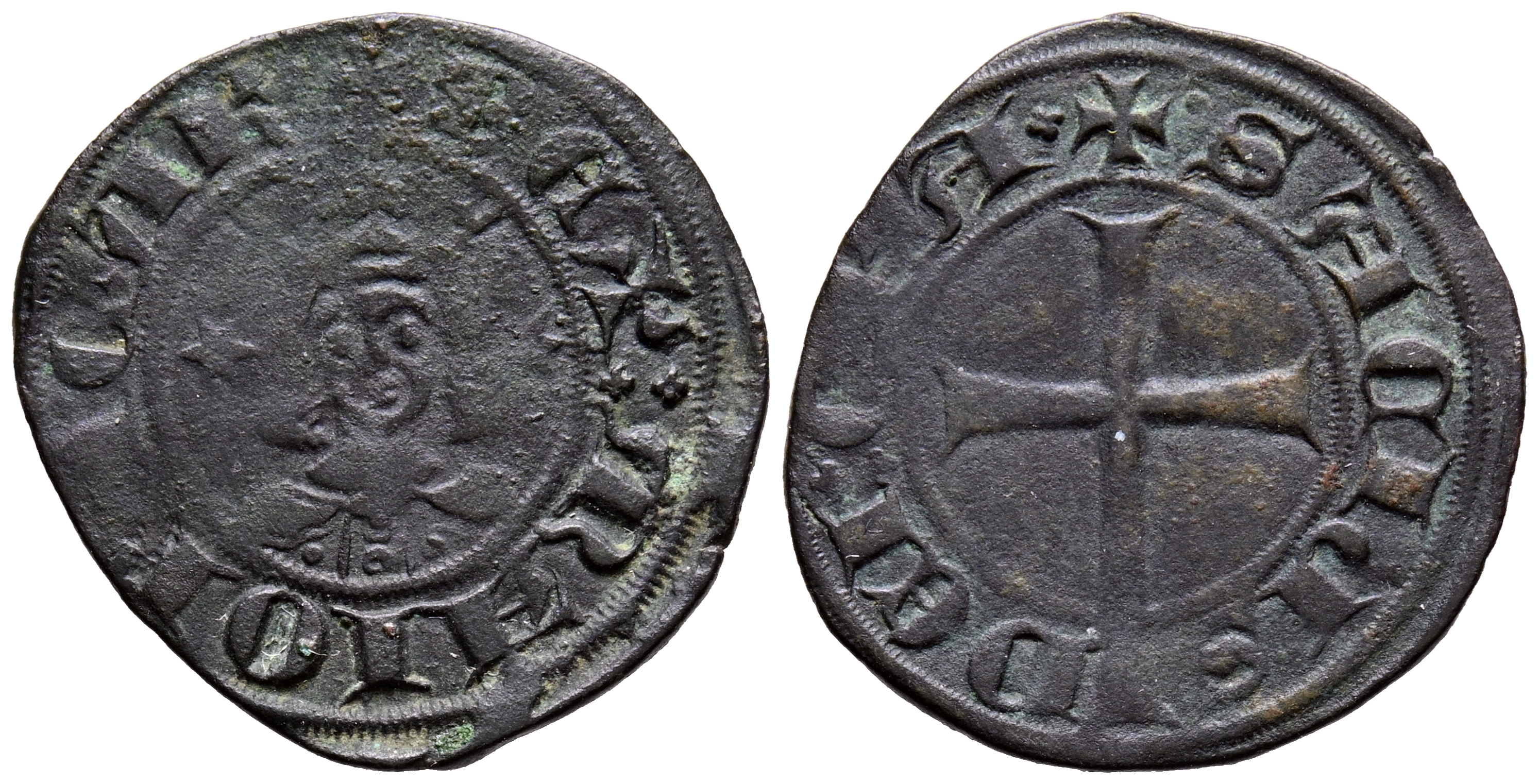 SANCHO I (1311-1324). Dobler. (Ve. 1,35g/21mm). Mallorca. (Cru V.S. 547). Anv: Busto coronado de Sancho I de frente entre estrellas, alrededor leyenda: REX MAIORICAR. Rev: Cruz latina, alrededor leyenda: SACIVS DEI GRA. MBC.