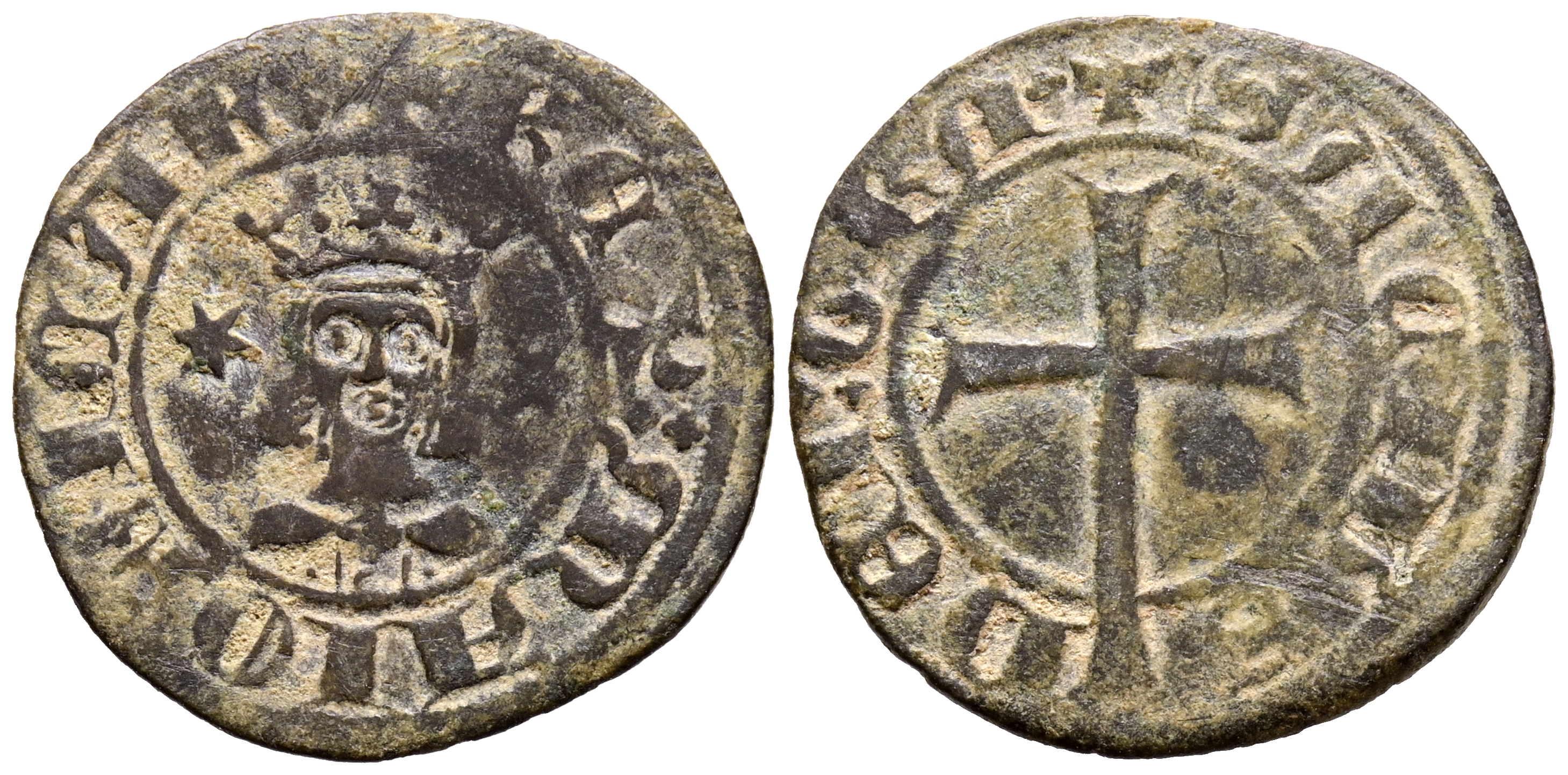 SANCHO I (1311-1324). Dobler. (Ve. 1,65g/20mm). Mallorca. (Cru V.S. 547). Anv: Busto coronado de Sancho I de frente entre estrellas, alrededor leyenda: REX MAIORICAR. Rev: Cruz latina, alrededor leyenda: SACIVS DEI GRA. MBC-.
