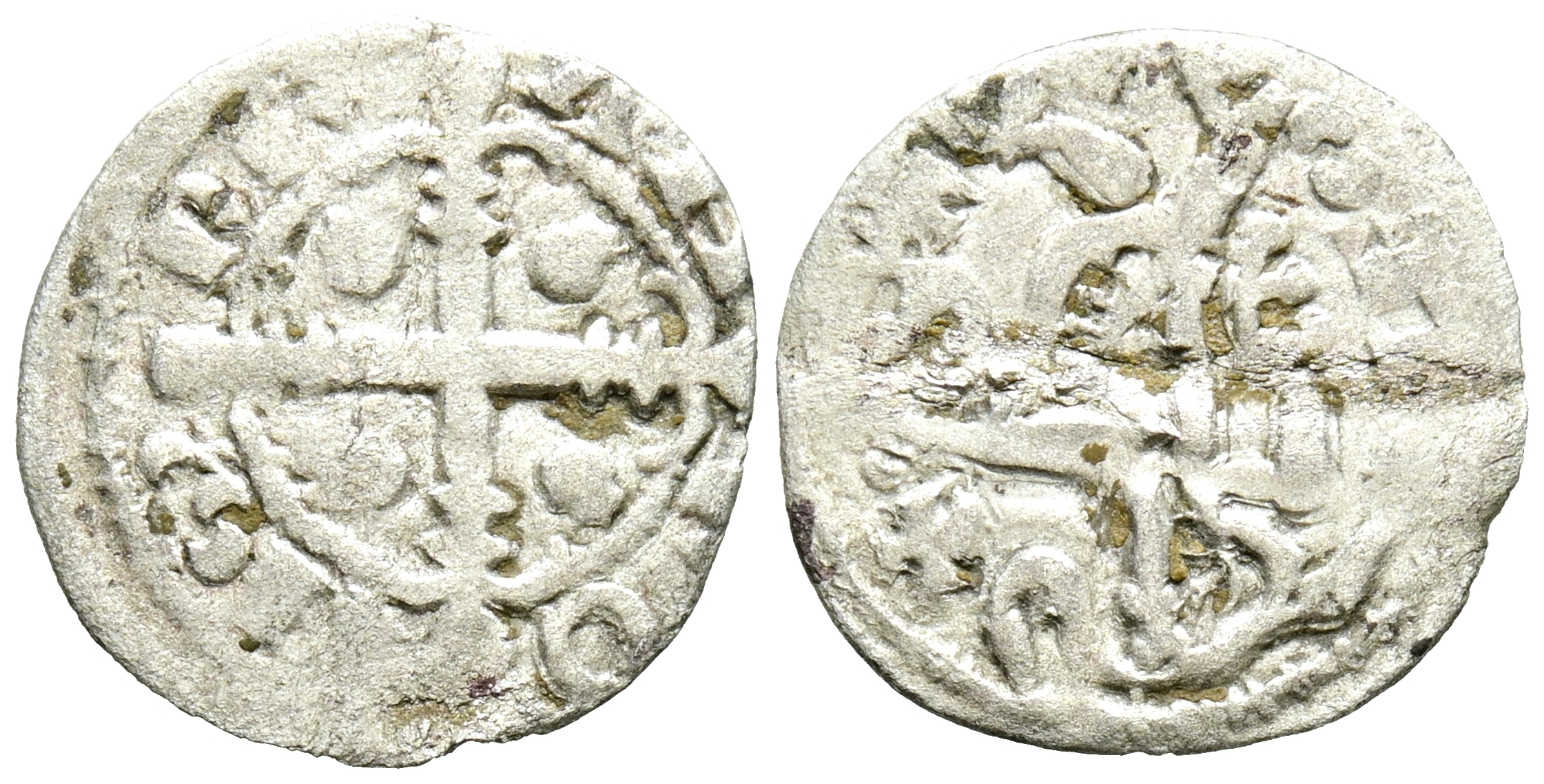 ALFONSO IX (1188-1230). Dinero. (Ve. 0,67g/16mm). Ceca indeterminada. (Imperatrix A9:5.37; FAB-121.1). Anv: Cruz floreada y veneras en los cuarteles, alrededor leyenda: ANFONS REX. Rev: León a derecha encima cruz, debajo leyenda: LEO, delante R retrógada. MBC-. Restos de plateado original. Escaso.