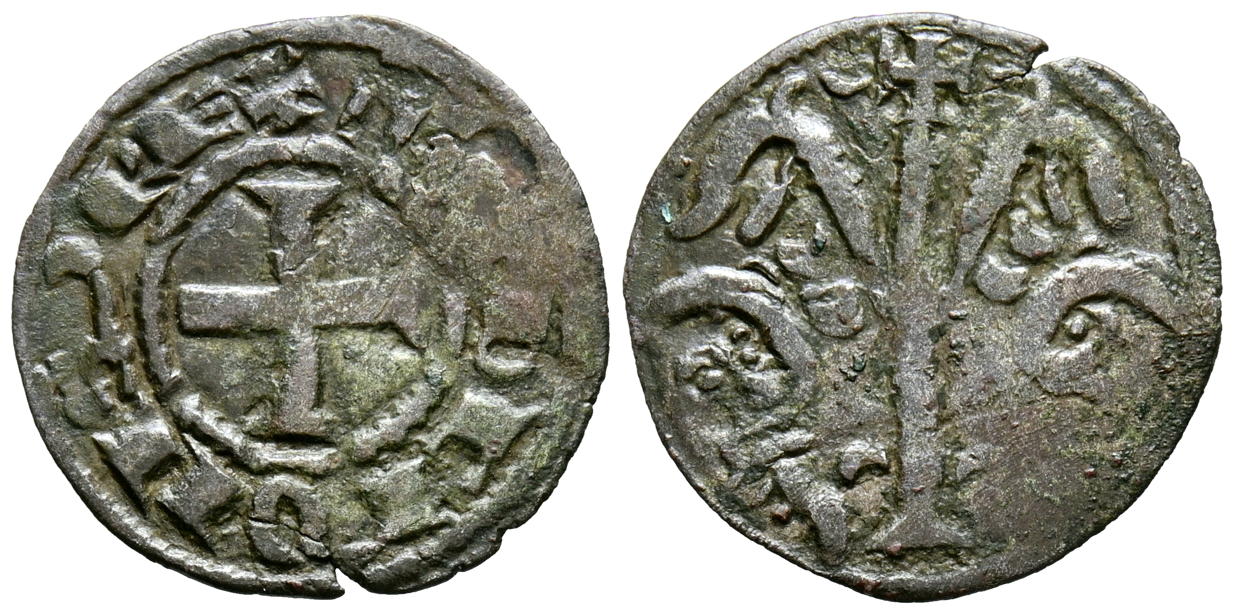 ALFONSO IX (1188-1230). Dinero. (Ve. 0,60g/17mm). Taller indeterminado. (Imperatrix A9:1.25; FAB-146). Anv: Cruz patada sin veros en los cuarteles, alrededor leyenda: ILDEFONS REX. Rev: Arbol, entre dos leones enfrentados. MBC+. Alabeada.