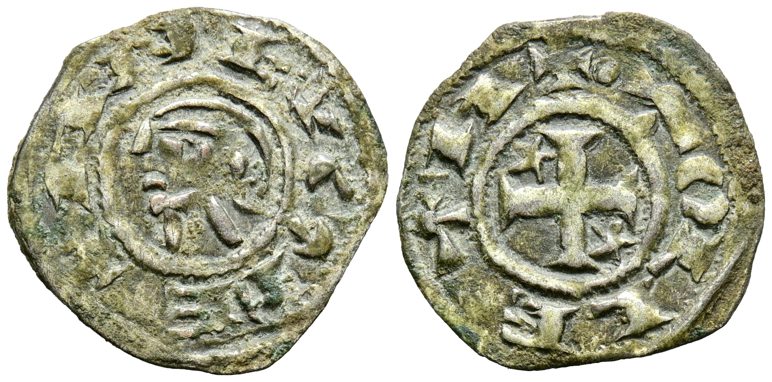 ALFONSO VIII (1158-1214). Dinero. (Ve. 0,76g/18mm). Toledo. (Imperatrix A8.28.10; FAB-25.3 como Alfonso I de Aragón). Anv: Busto a izquierda dentro de gráfilar circular, alrededor leyenda: ANFVS REX. Rev: Cruz patada con estrella en primer y cuarto cuadrante, todo dentro de una gráfila circular, alrededor leyenda: TOLLETA. MBC.