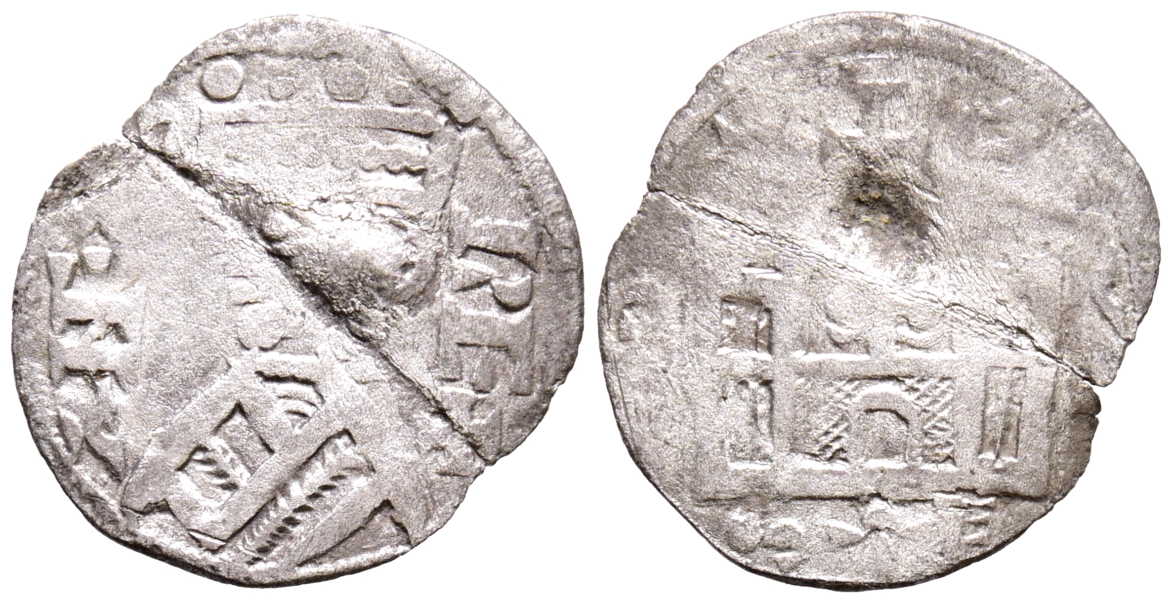 ALFONSO VIII (1158-1214). Dinero. (Ve. 0,71g/17mm). Calahorra. (Imperatrix A8:36.26; FAB-196). Anv: Busto coronado de Alfonso VIII a izquierda, alrededor leyenda: ANFVS REX. Rev: Castillo con cruz central adornada, a la izquierda estrella, a la derecha C, alrededor leyenda: CASTELE. MBC-. Marca de doblez.