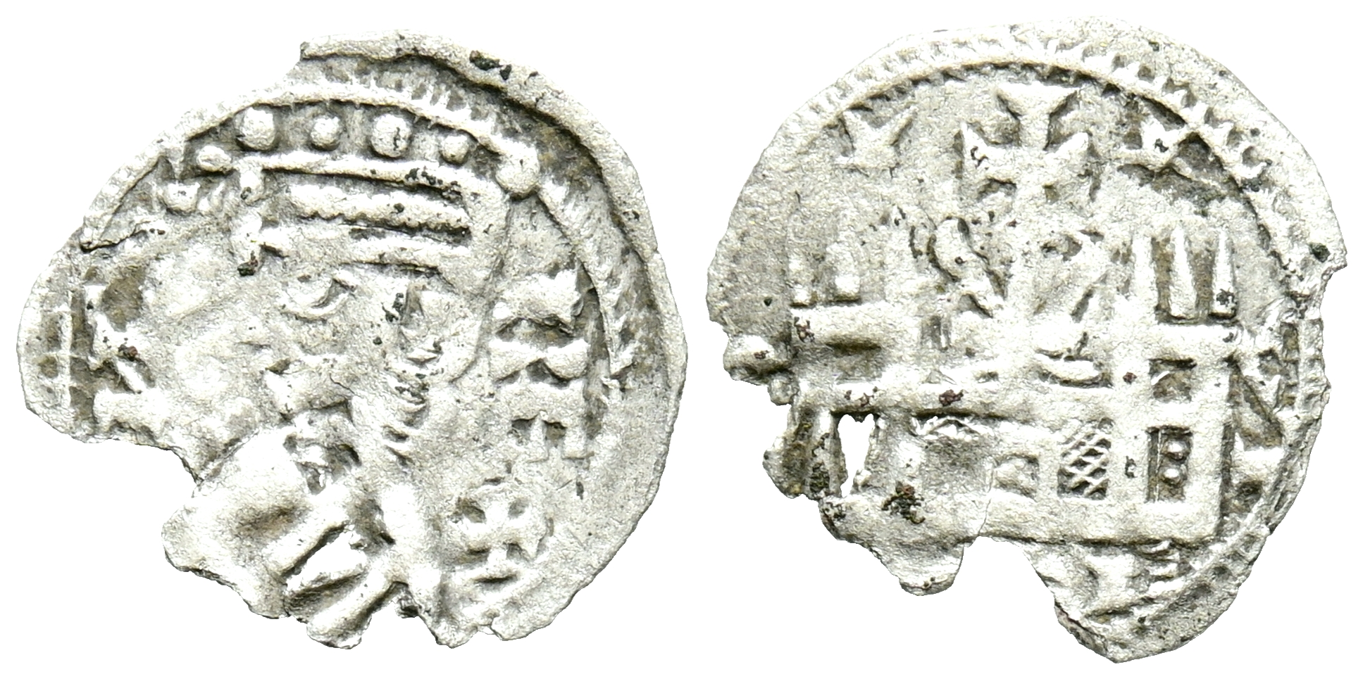 ALFONSO VIII (1158-1214). Dinero. (Ve. 0,19g/13mm). Posiblemente Toledo. (Imperatrix A8:37.1; FAB-206). Anv: Busto coronado de Alfonso VIII a izquierda, alrededor leyenda: ANFVS REX. Rev: Castillo con cruz central adornada, a la izquierda creciente, a la derecha estrella, alrededor leyenda: CASTELE. MBC-.