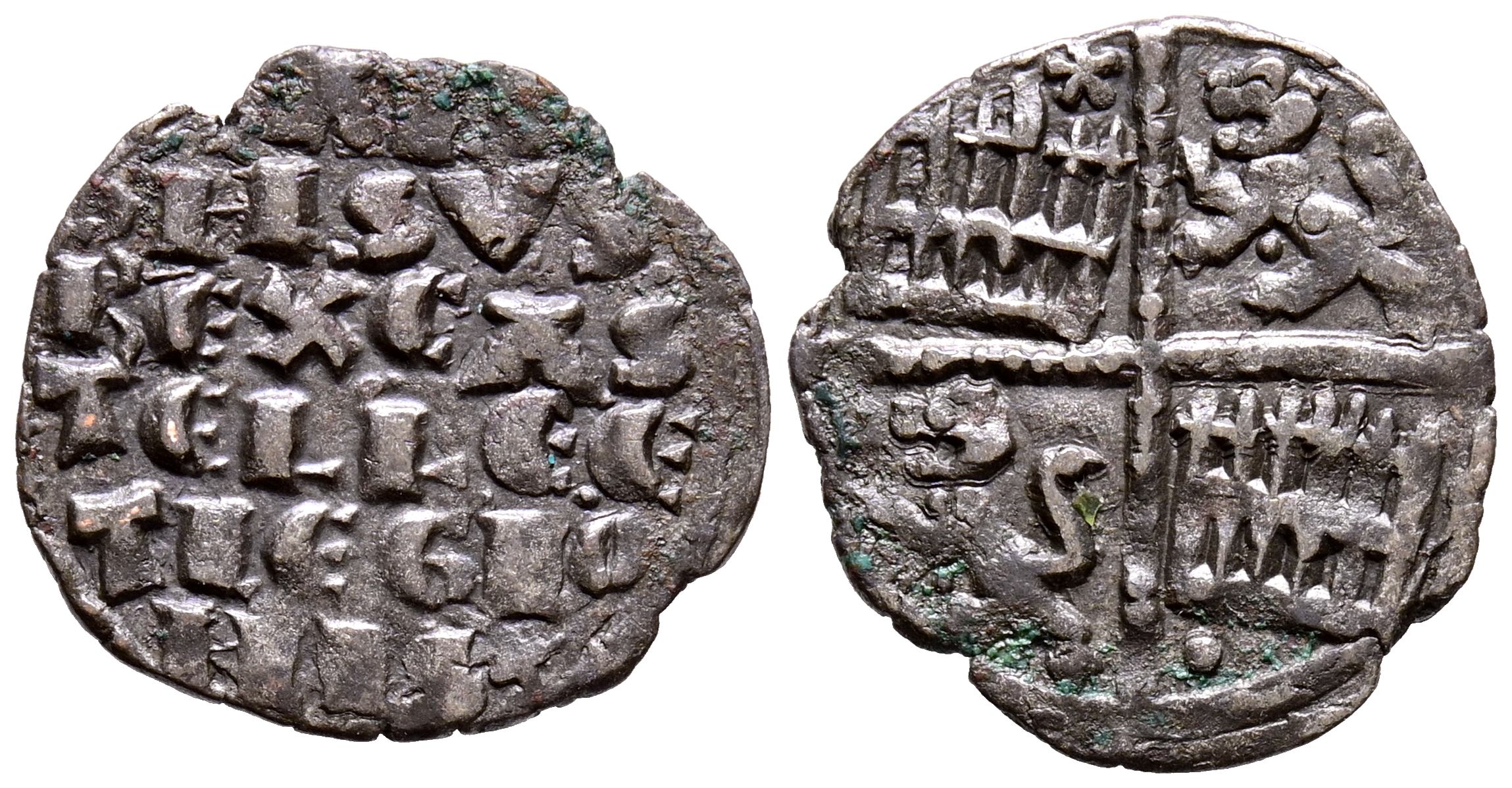 ALFONSO X (1252-1284). Dinero Alfonsí ''de la 1º guerra de Granada". (Ve. 0,83g/16mm). Marca de ceca: Estrella y Punto. (Imperatrix A10:4.48; FAB-234.1var). Anv: Leyenda en seis líneas: ALF/ONSVS/REX CAS/TELLE E/T LEGIO/NIS. Rev: Castillos y leones con marca de ceca, estrella en 1º cuadrante y punto en el 4º. MBC+. Atractivo ejemplar.