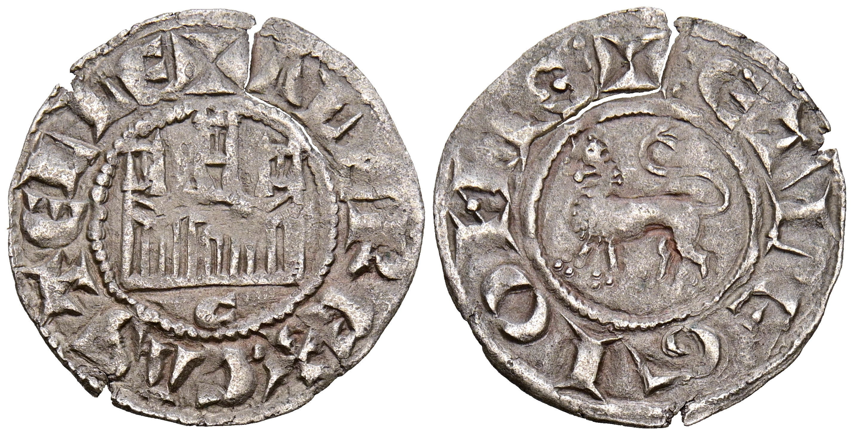 ALFONSO X (1252-1284). Dinero prieto. (Ve. 0,96g/20mm). Córdoba. (Imperatrix A10:6.7; FAB-249, como pepión). Anv: Castillo y debajo C, todo dentro de gráfila circular, alrededor leyenda: ALF REX CASTELLE. Rev: León a izquierda dentro de gráfila circular, alrededor leyenda: ET LEGIONIS. MBC. Grieta. Atractivo y raro ejemplar.