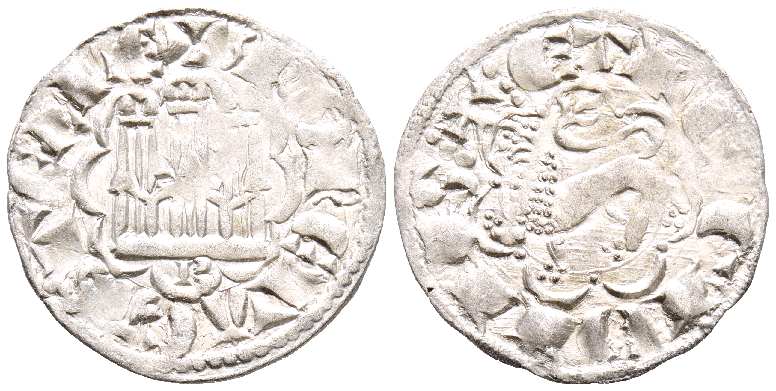 ALFONSO X (1252-1284). Blanca Alfonsí (de la 2º Guerra de Granada). (Ve. 0,85g/18mm). Burgos. (Imperatrix A10:11.6; FAB-263 como Novén). Anv: Castillo y debajo B dentro de gráfila lobular, alrededor leyenda: MONETA CASTELLE. Rev: León rampante a izquierda dentro de gráfila lobular, alrededor leyenda: ET LEGIONIS. MBC+. Interesante ejemplar.