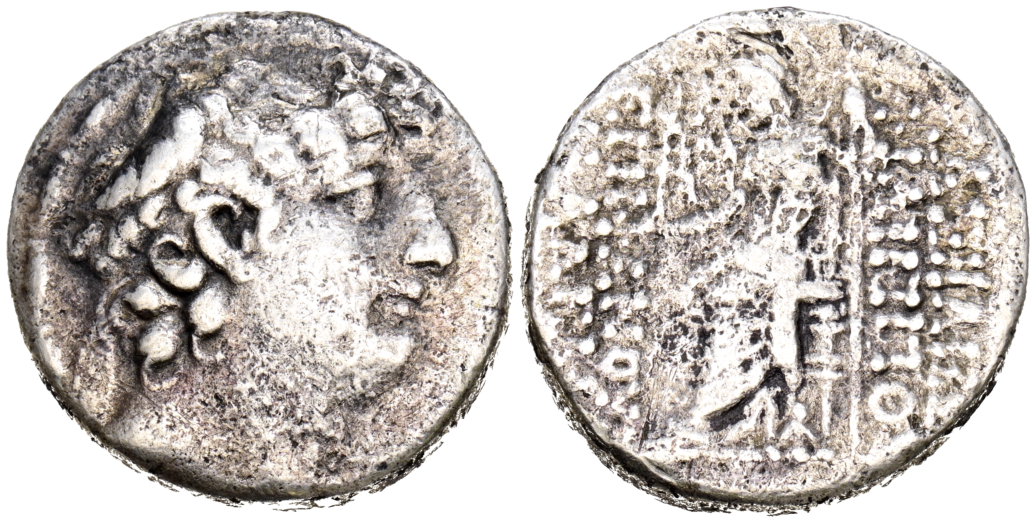 REINO SELEUCIDA, Filipo I Filadelfos. Tetradracma. (Ar. 12,93g/25mm). 93-83 a.C. Antioquía. (HGC 9, 1320). Anv: Cabeza laureada de Filipo I a derecha. Rev: Zeus sentado a izquierda portando cetro y Nike con corona de laurel, delante monograma: AP, al rededor leyenda griega: ΒΑΣΙΛΕΩΣ ΦΙΛΙΠΠΟY ΕΠΙΦΑΝΟYΣ ΦΙΛΑΔΕΛΦOY. MBC-.