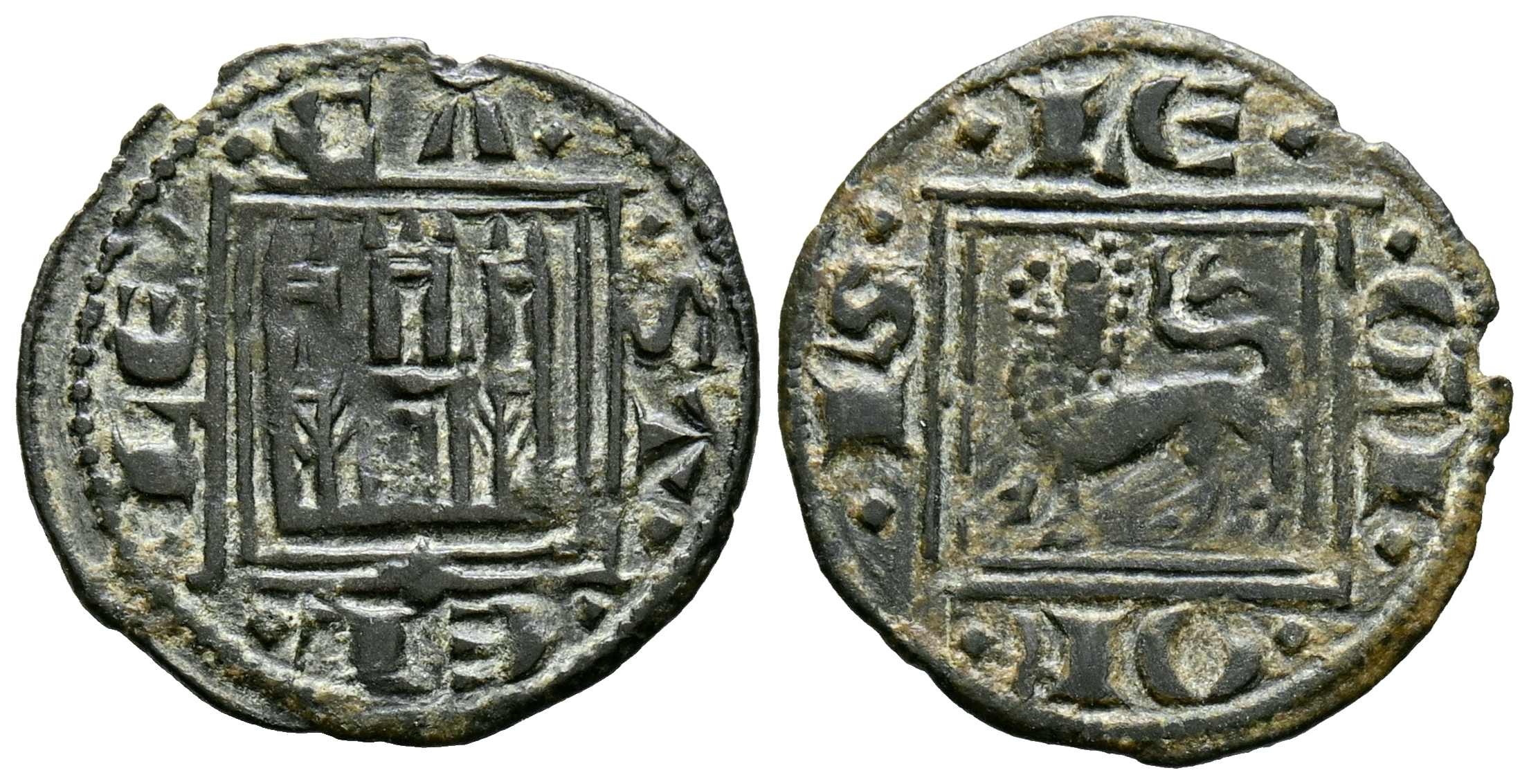 ALFONSO X (1252-1284). Pugesa / Óbolo. (Ve. 0,53g/15mm). Coruña. (Imperatrix A10:14.50; FAB-280.1). Anv: Castillo dentro de gráfila cuadrada, debajo venera, alrededor leyenda: CASTELLE. Rev: León pasante a izquierda dentro de gráfila cuadrada, alrededor leyenda: LEGIONIS. MBC+.