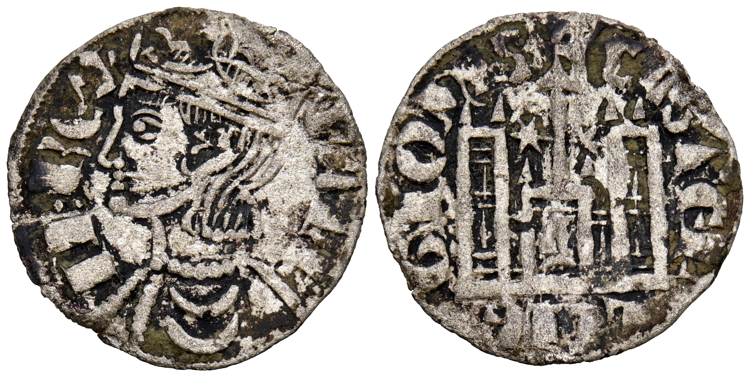 SANCHO IV (1284-1295). Cornado. (Ve. 0,86g/19mm). Jaén. (Imperatrix S4:3.19; FAB-no cita). Anv: Busto coronado de Sancho IV a izquierda, alrededor leyenda: SANCII REX. Rev: Castillo con cruz sobre vástago central entre estrellas, y letra I en la puerta, alrededor leyenda: CASTELLE E LEGIONIS. MBC+.