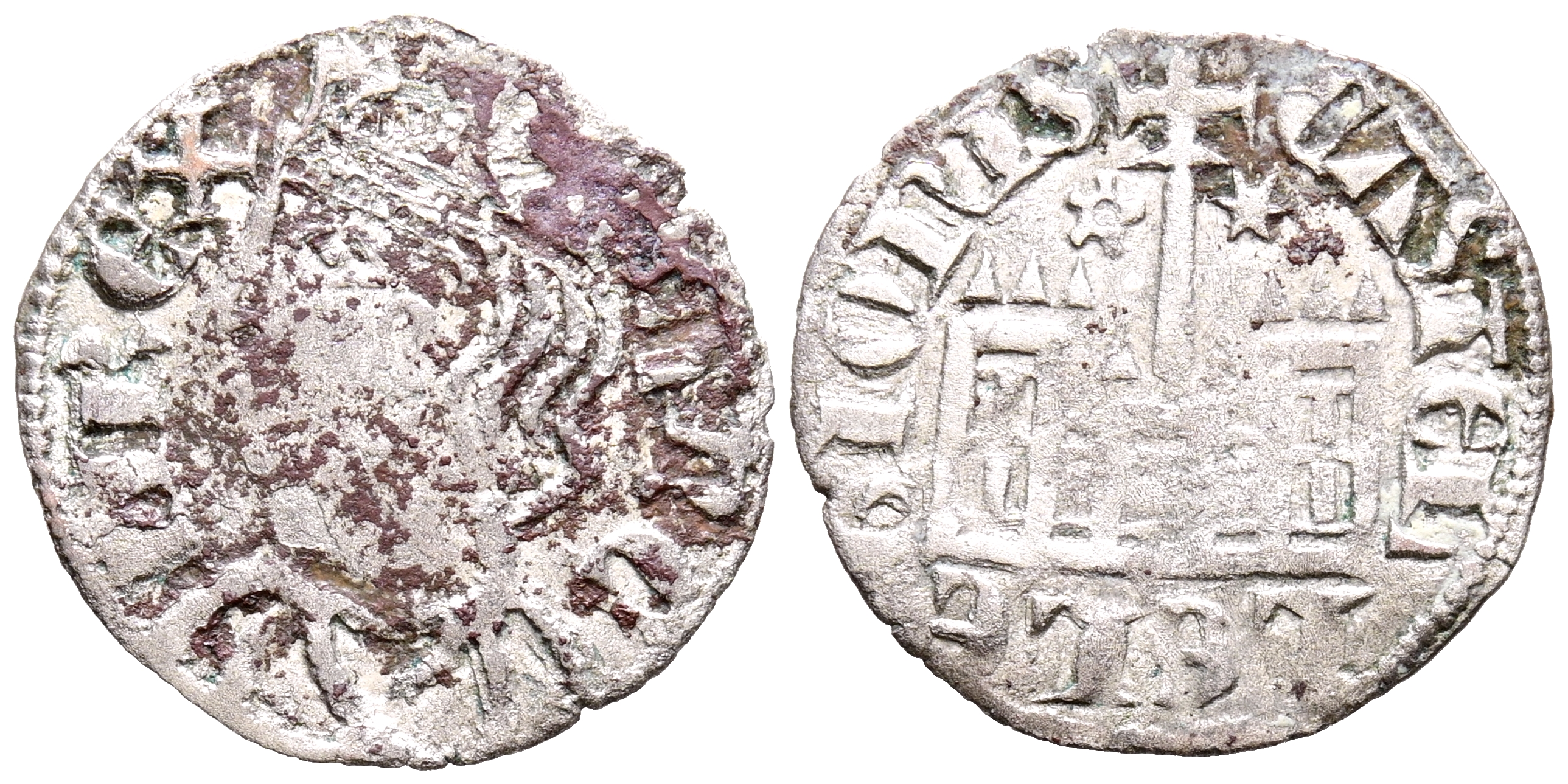 SANCHO IV (1284-1295). Cornado. (Ve. 0,70g/18mm). Marca de ceca: Roel estrellado y Estrella. (Imperatrix S4:3.67; FAB-304.var). Anv: Busto coronado a izquierda, alrededor leyenda: SANCII REX. Rev: Castillo con cruz sobre vástago central entre roel estrellado y estrella, alrededor leyenda: CASTELLE E LEGIONIS. MBC. Depósitos en anverso.