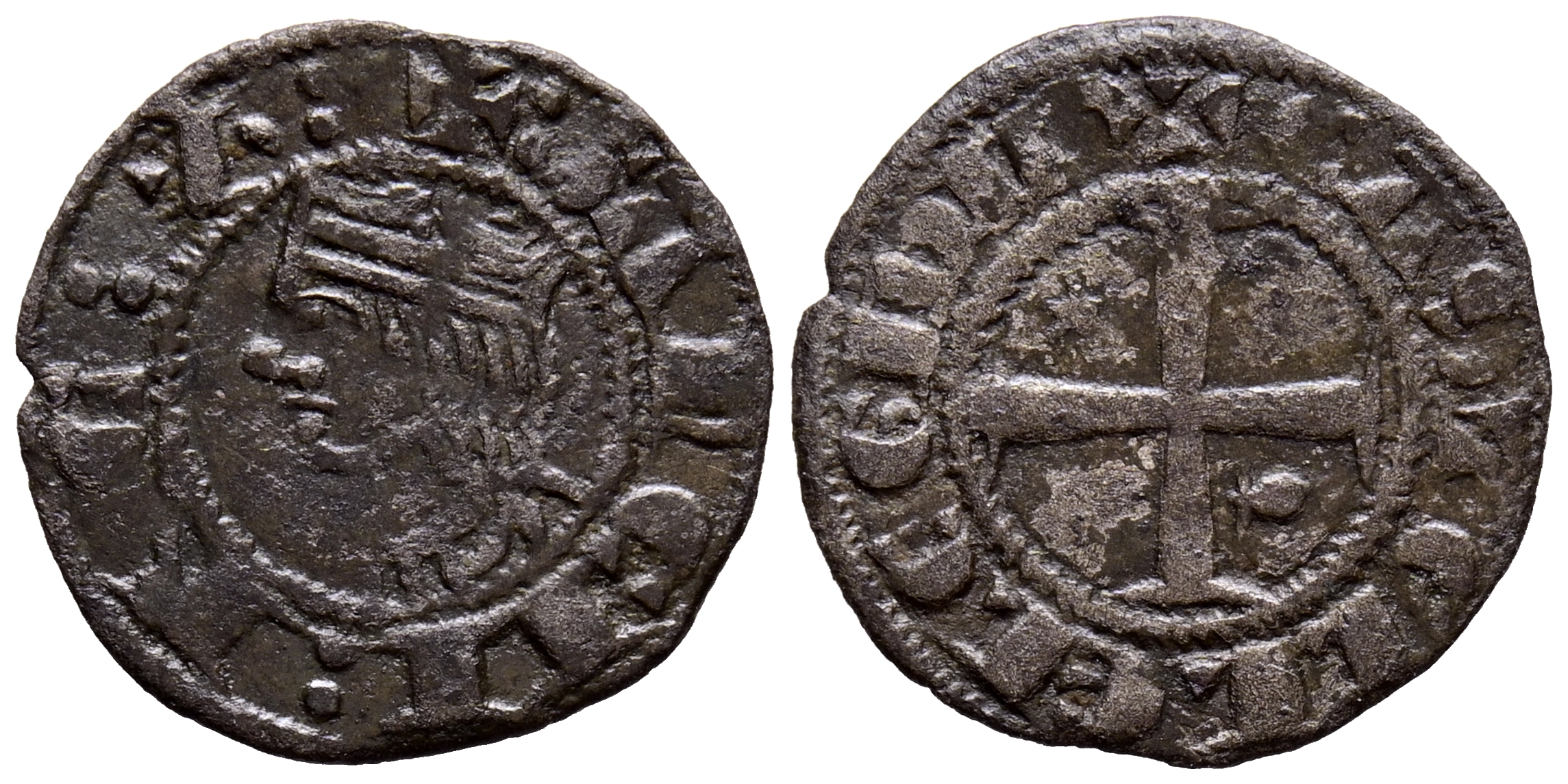 SANCHO IV (1284-1295). Meaja Coronada. (Ve. 0,67g/16mm). Coruña. (Imperatrix S4:6.18; FAB-309.3 como seisén). Anv: Busto coronado de Sancho IV a izquierda, alrededor leyenda: SANCII REX. Rev: Cruz patada con estrella en primer cuadrante y venera en el cuarto, alrededor leyenda: CASTELLE E LEGIONIS. MBC+. Muy escasa.