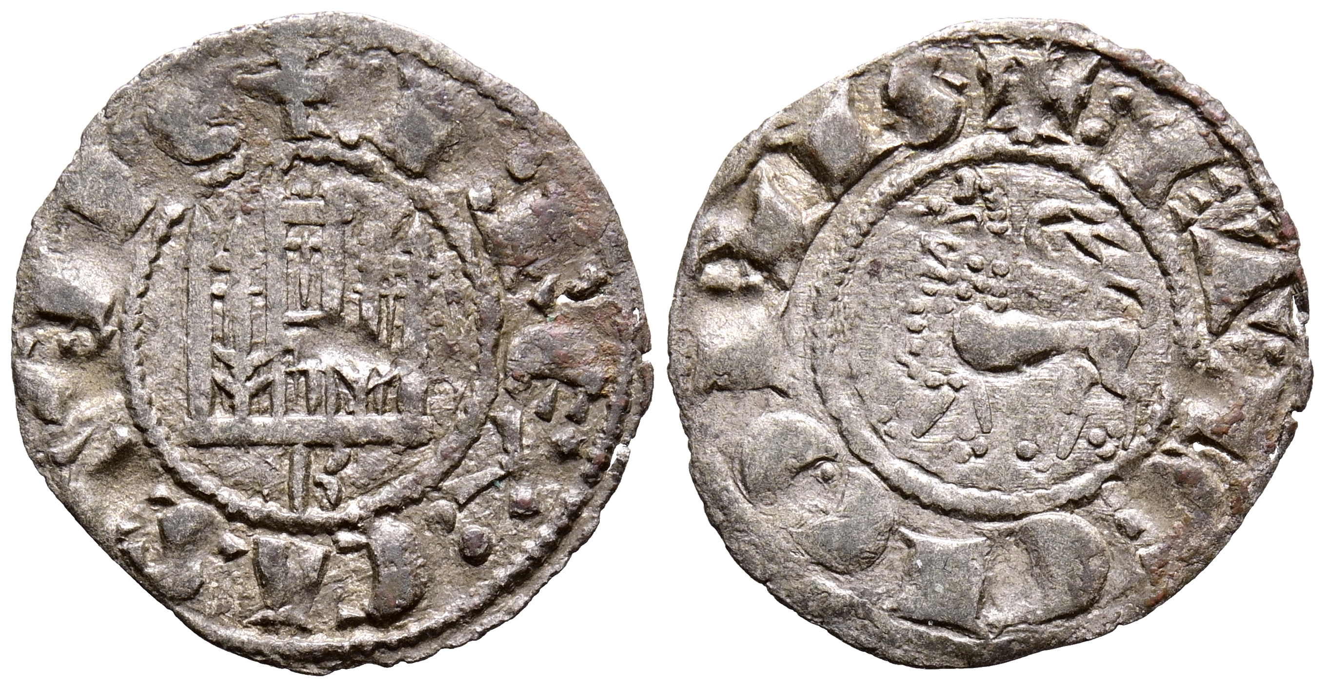 FERNANDO IV (1295-1312). Dinero. (Ve. 0,65g/20mm). Burgos. (Imperatrix F4:1.2; FAB-319, como Pepión). Anv: Castillo, debajo: B, todo dentro de gráfila circular, alrededor leyenda: F REX CASTELLE. Rev: León rampante a izquierda dentro de gráfila circular, alrededor leyenda: ET LEGIONIS. MBC+.