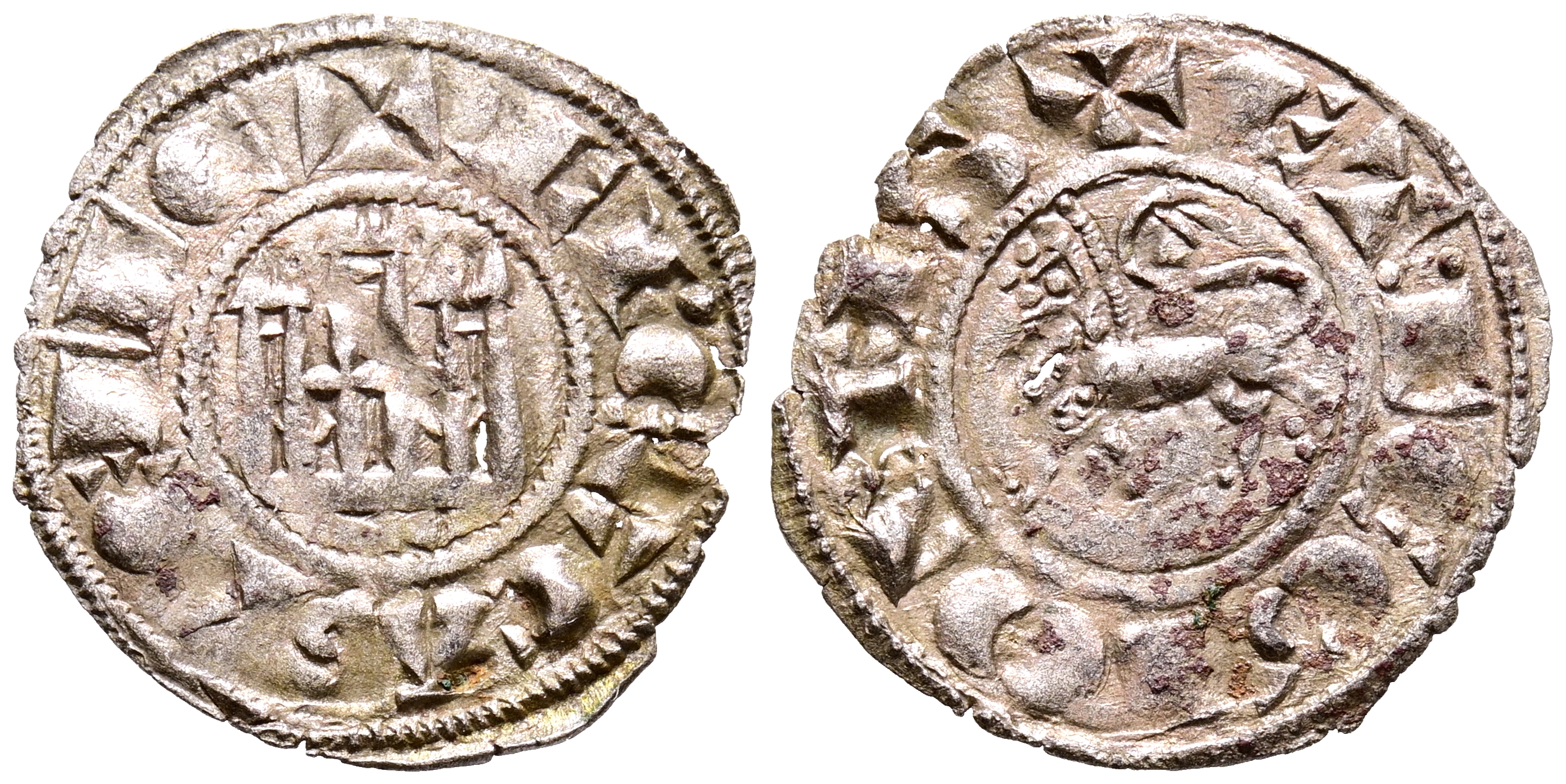 FERNANDO IV (1295-1312). Dinero. (Ve. 0,64g/20mm). Sin marca de ceca. (Imperatrix F4:1.10; FAB-318, como pepión). Anv: Castillo dentro de gráfila, alrededor leyenda: F REX CASTELLE. Rev: León pasando a izquierda dentro de gráfila, alrededor leyenda: ET LEGIONIS. MBC+.