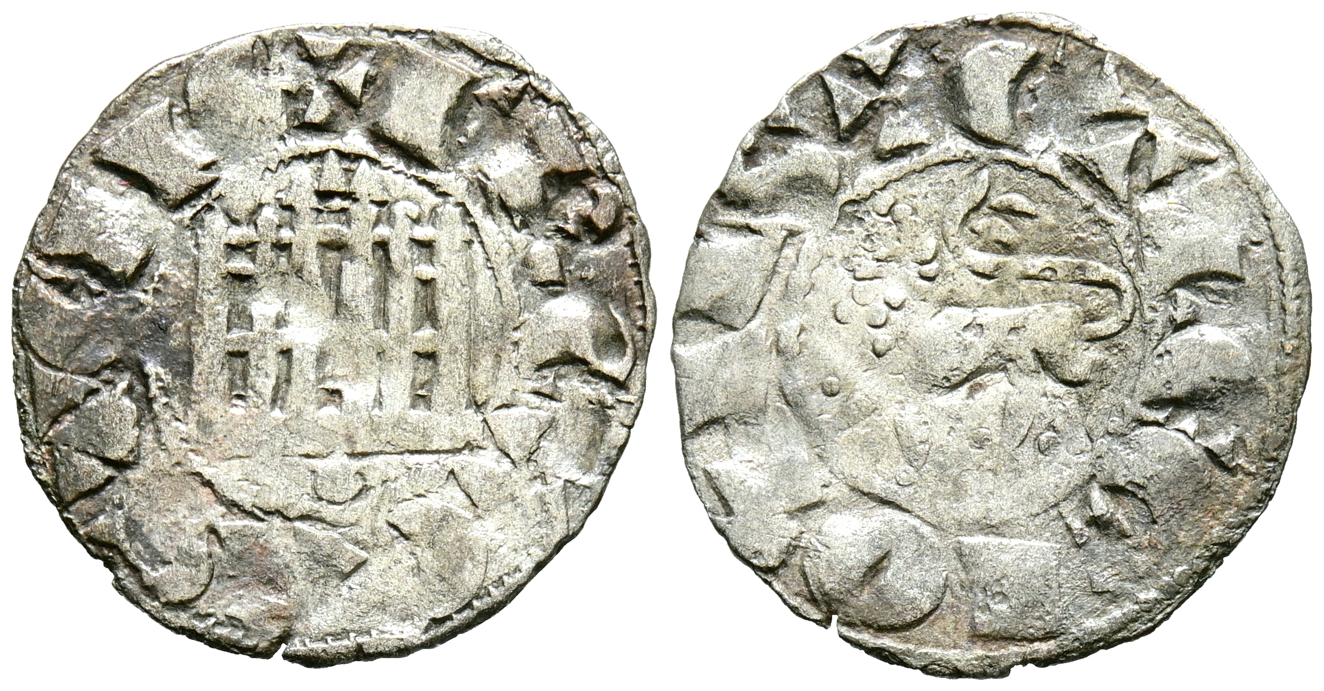 FERNANDO IV (1295-1312). Dinero. (Ve. 0,71g/19mm). Coruña. (Imperatrix F4:2.60; FAB-321, como pepión). Anv: Castillo, debajo venera, todo dentro de gráfila circular, alrededor leyenda: F REX CASTELLE. Rev: León a izquierda dentro de gráfila circular: ET LEGIONIS. MBC-.