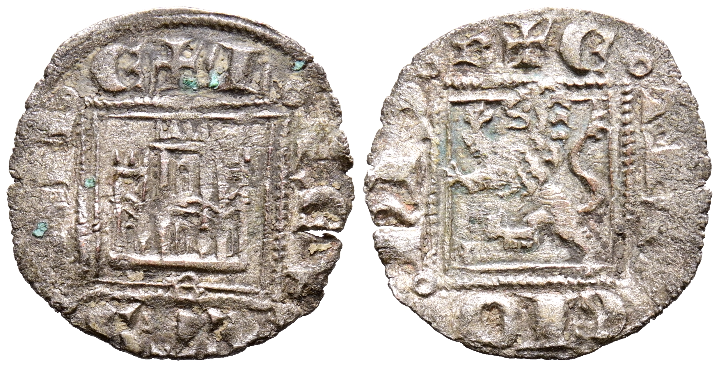 ALFONSO XI (1312-1350). Dinero Novén. (Ve. 0,77g/18mm). Burgos. (Imperatrix A11:1.6; FAB-355.2). Anv: Castillo, debajo B, todo dentro de gráfila cuadrada, alrededor leyenda: A REX CAS TELL E. Rev: León rampante a izquierda con marca de aspa delante, todo dentro de gráfila cuadrada, alrededor leyenda: E TLE GIO NIS B. MBC.