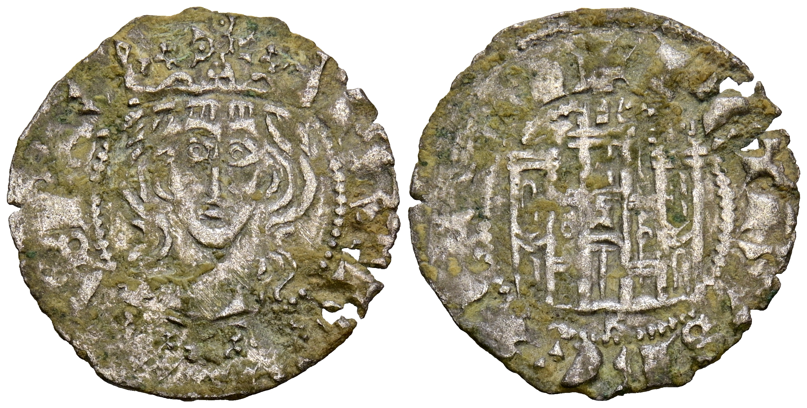 PEDRO I (1350-1368). Dinero coronado/Cornado. (Ve. 0,59g/19mm). Burgos. (Imperatrix P1:1.1; FAB-396). Anv: Busto de Pedro I coronado de frente cortando la gráfilar circular, alrededor leyenda: PETR VS REX. Rev: Castillo, debajo B, todo dentro de gráfila circular, alrededor leyenda: + PETRVS REX CASTELLE. MBC-. Escasa.