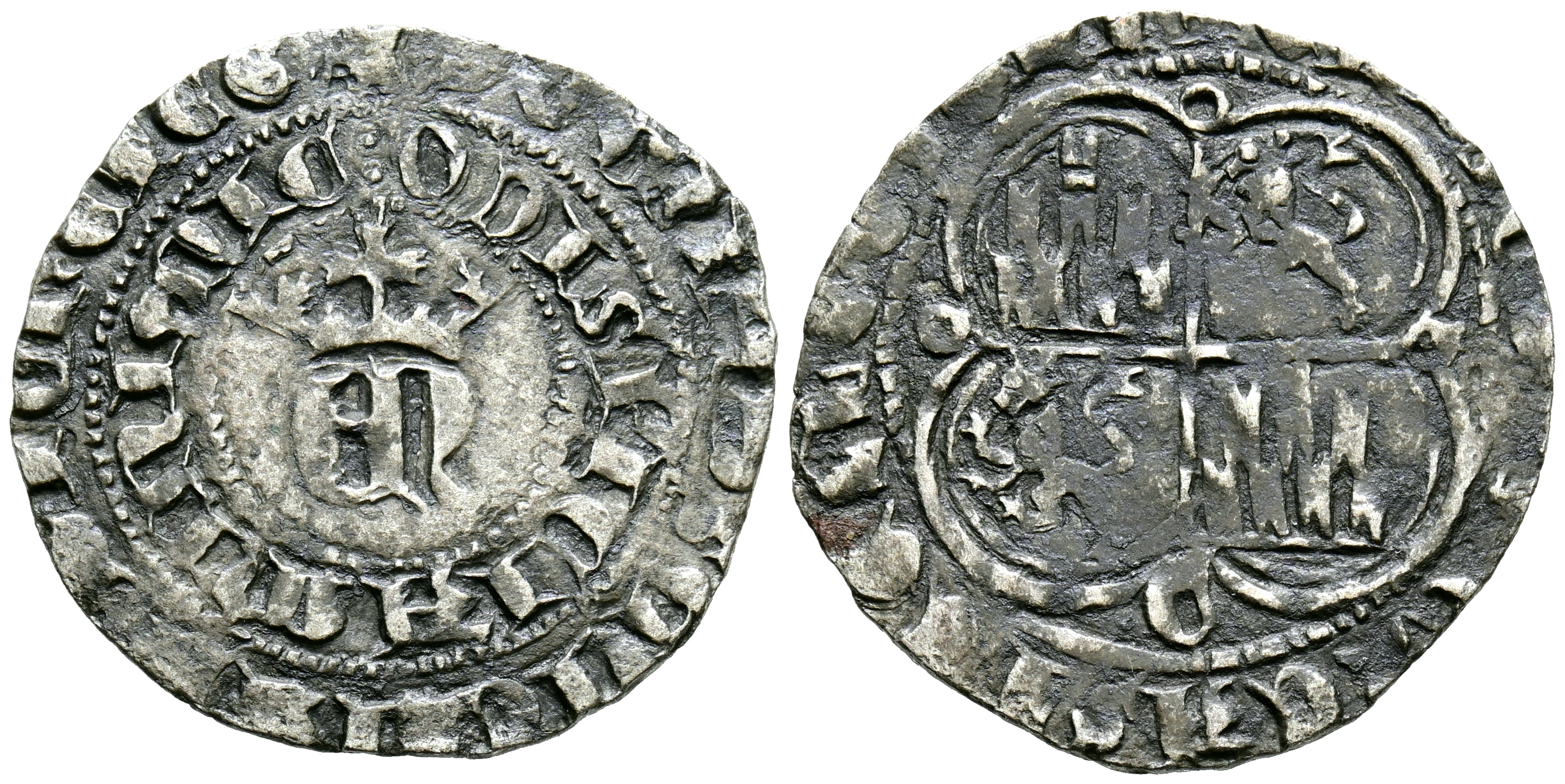 ENRIQUE II (1368-1379). Real de Vellón. (Ae. 2,61g/26mm). Córdoba. (Imperatrix E2:2.19; FAB-415). Anv: Anagrama EN coronado, alrededor leyenda en doble orla: DOMINVS MICHI ADIVTOR ET EGO DISPICIAM INIMIC. Rev: Cuartelado de castillos y leones rampantes a izquierda dentro de gráfila lobular, alrededor leyenda: ENRICV REX CASTELLE E LEGIONIS. MBC/MBC-.