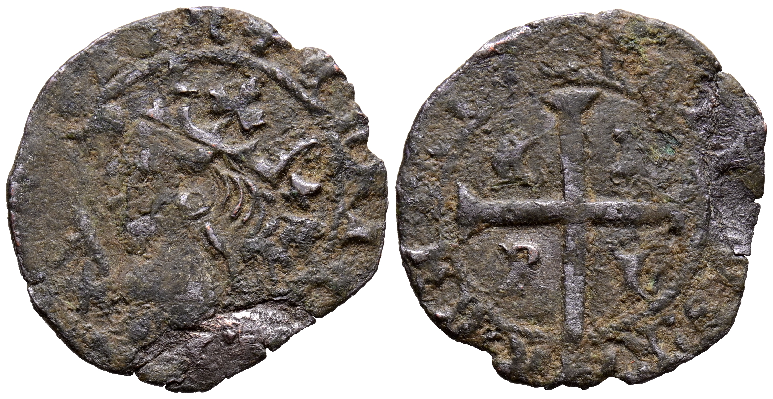 ENRIQUE II (1368-1379). Cruzado. (Ve. 1,48g/22mm). Cuenca. (Imperatrix E2:11.74; FAB-4567). Anv: Cabeza coronada de Enrique II a izquierda, delante: Q, detrás: Cuenco/A, todo dentro de gráfila circular, alrededor leyenda: ENRICVS REX LEGIONIS. Rev: Cruz latina, en los cuarteles E-N-R-I, alrededor leyenda: ENRICVS REX CASTELLE. BC+/BC. Rara.