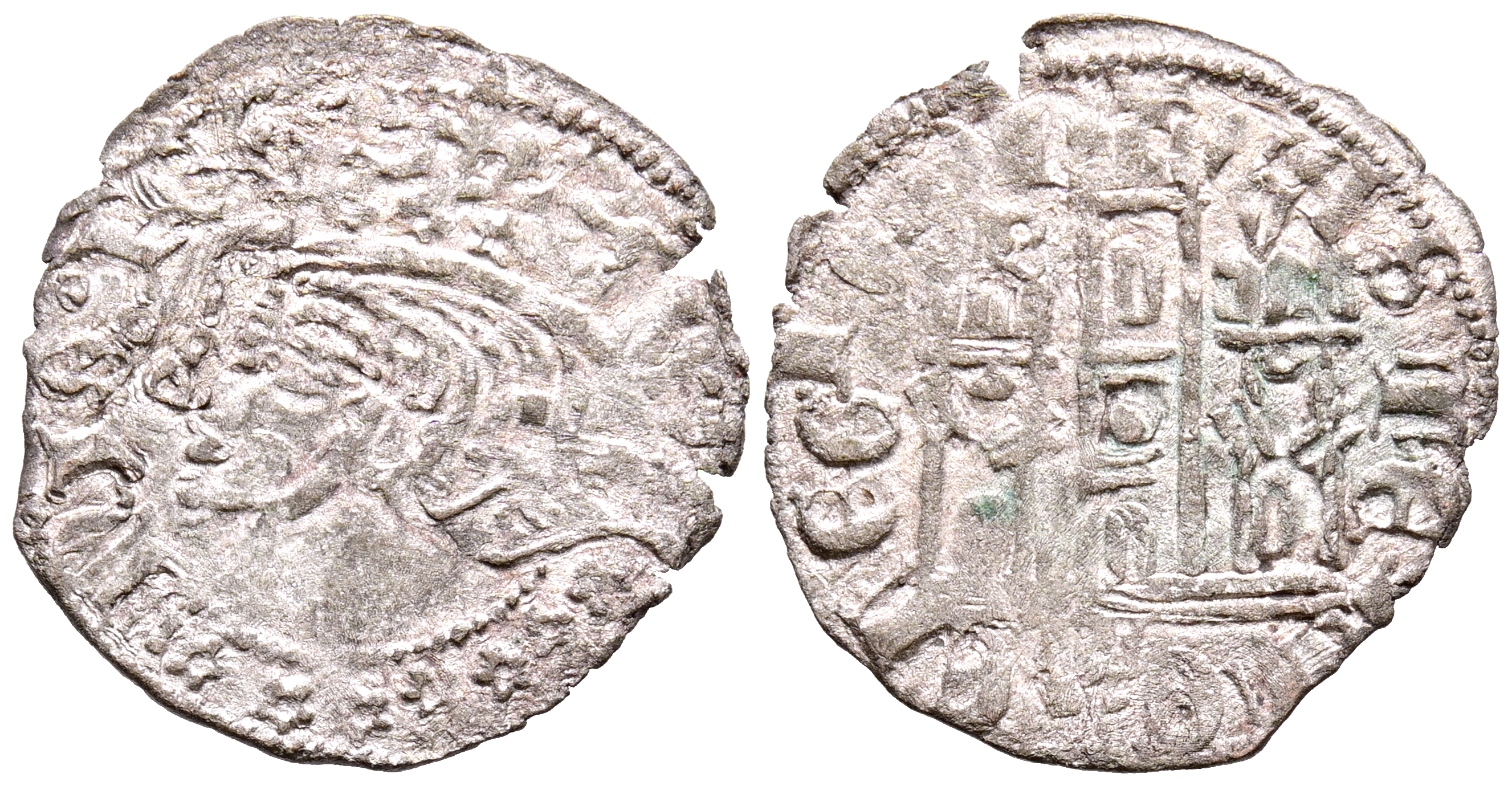 JUAN I (1379-1390). Cornado. (Ve. 0,68g/19mm). Burgos. (Imperatrix J1:7.5; FAB-566.1). Anv: Busto coronado de Juan I a izquierda, alrededor leyenda: IOHANES REX. Rev: Castillo, sobre las torres: B-V, debajo: B, alrededor leyenda: CASTELLE E LEGIONIS. MBC.