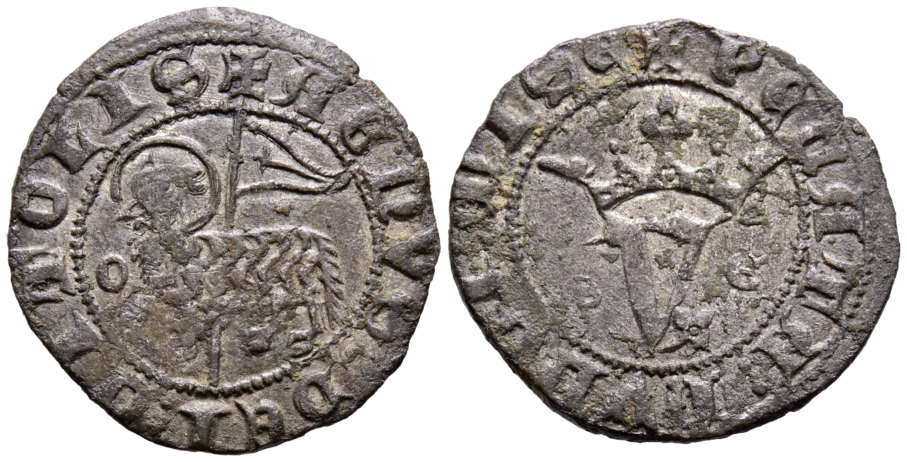 JUAN I (1379-1390). Blanca del Agnus Dei. (Ve. 2,21g/22mm). Segovia. (Imperatrix J1:9.31; FAB-554 var). Anv: Agnus Dei a izquierda con estandarte y O delante, todo dentro de gráfila circular y alrededor leyenda: AGNVS DEI QVTOLIS. Rev: Y coronada dentro de gráfila con las letras S y E a los lados, alrededor leyenda: PECATA MVNDI MISE. MBC+.