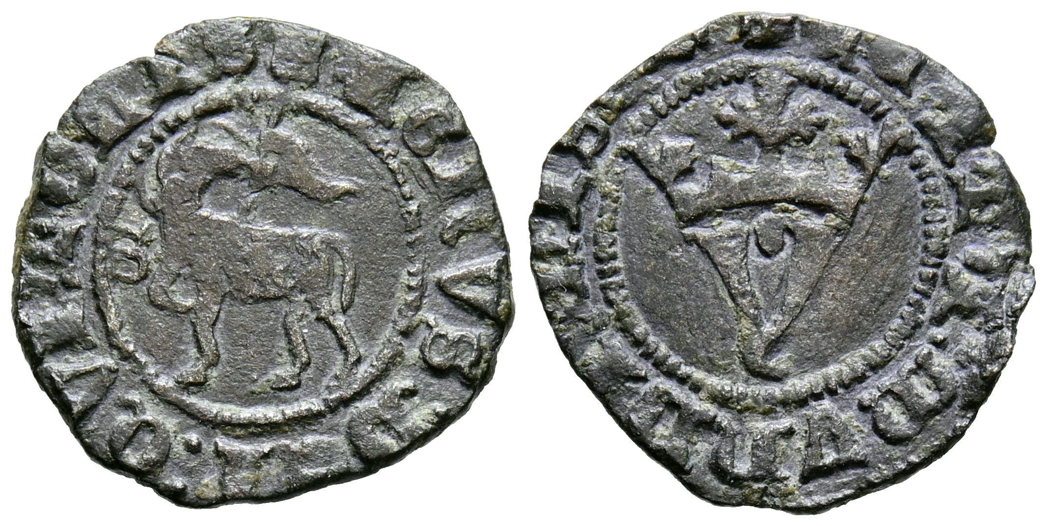 JUAN I (1379-1390). 1/2 Blanca. (Ve. 0,81g/15mm). Sevilla. (Imperatrix J1:10.8; FAB-562). Anv: Cordero de Dios avanzando a izquierda mirando a derecha, en campo S, detrás estandarte, todo dentro de gráfila, alrededor leyenda: AGNVS DEI QVI TOLIS. Rev: Y coronada dentro de gráfila, alrededor leyenda: ECATA MVNDI MISER. MBC+. Interesante ejemplar.