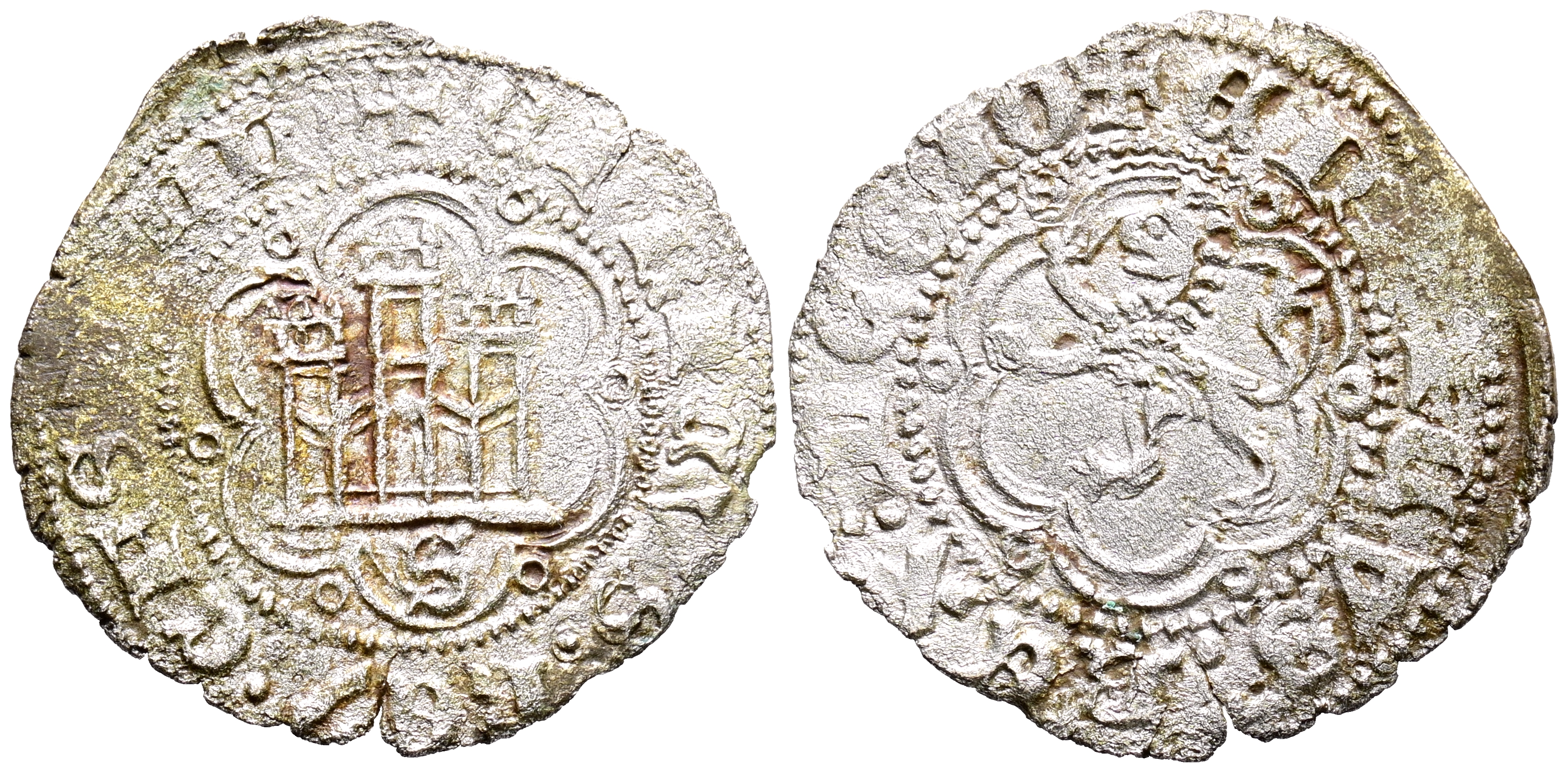ENRIQUE III (1390-1406). Blanca. (ve. 1,83g/25mm). Sevilla. (Imperatrix E3:1,14; FAB-602.2). Anv: Castillo, debajo: S, dentro de gráfila polilobular doble, alrededor leyenda: ENRICVS REX CASTEL. Rev: León rampante a izquierda dentro de gráfila polilobular, alrededor leyenda: ENRICVS REX CASTELL. MBC+.
