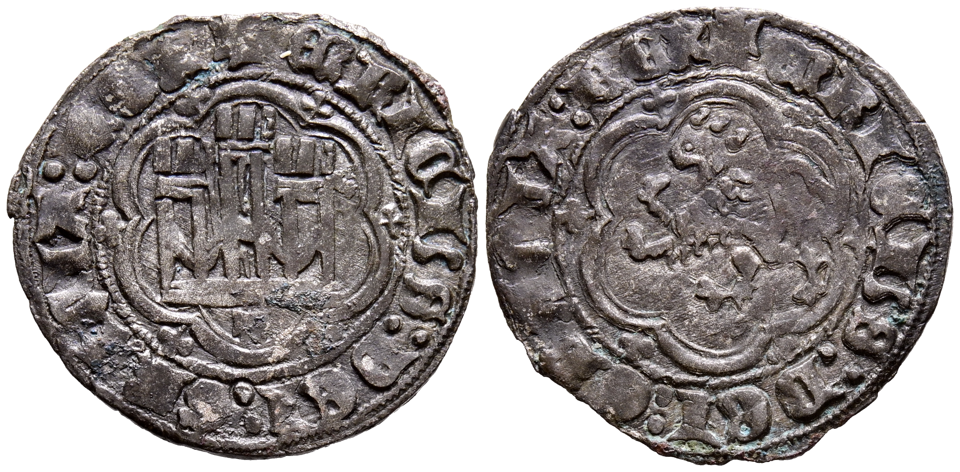 ENRIQUE III (1390-1406). Blanca. (Ae. 2,18g/23mm). Toledo. (Imperatrix E3:1,21; FAB-603). Anv: Castillo, debajo: T, dentro de gráfila lobular, alrededor leyenda: ENRICVS DEI GRACIA RE. Rev: León rampante a izquierda dentro de gráfila lobular, alrededor leyenda: ENRICVS DEI GRACIA R. MBC+.