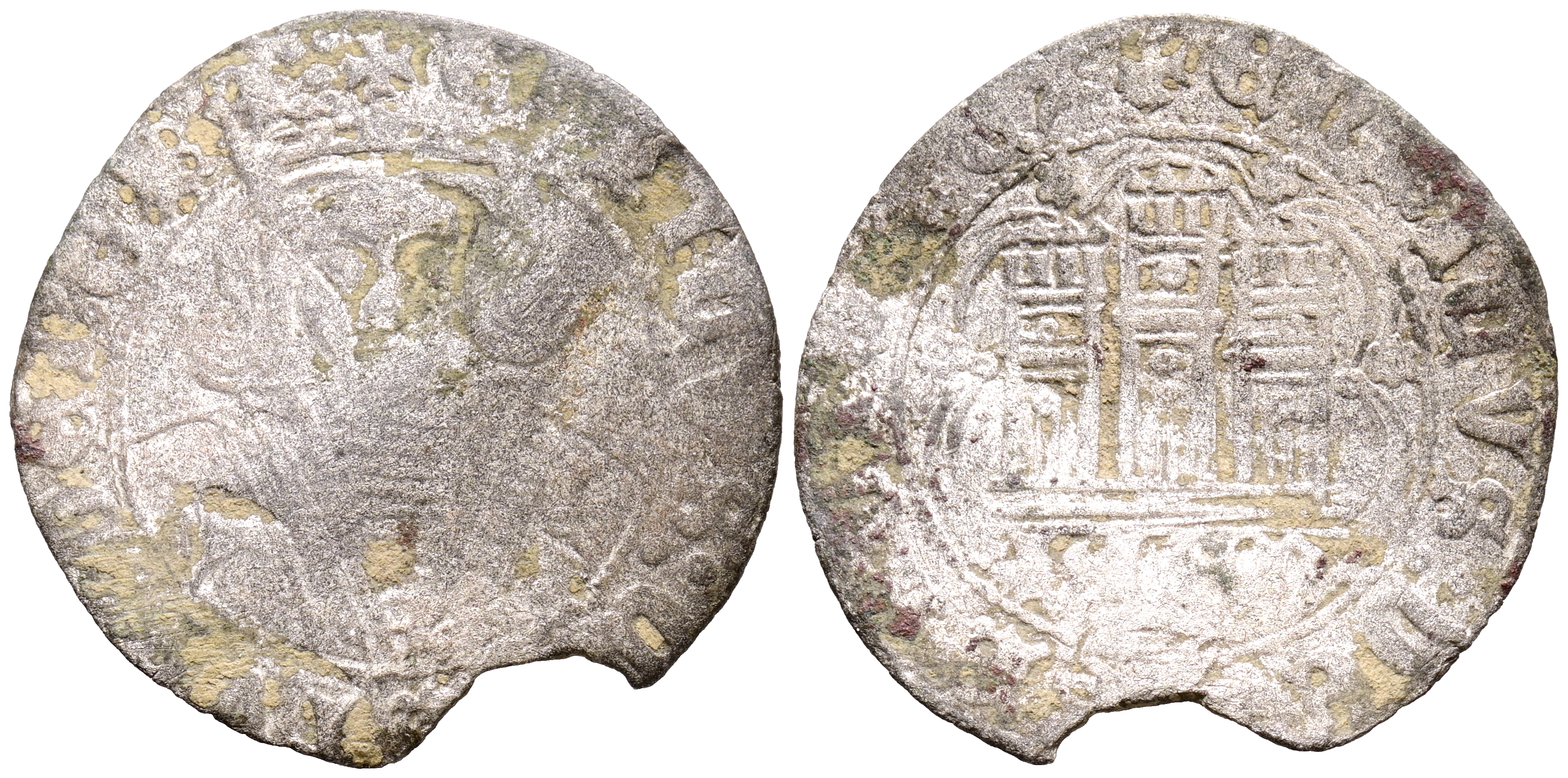 ENRIQUE IV (1454-1474). Cuartillo. (Ve. 2,30g/26mm). Jaén. (Imperatrix E4:14.97; FAB-746). Anv: Busto coronado de Enrique IV de frente, alrededor leyenda: ENRICVS CARTVS DEI GRA. Rev: Castillo dentro de gráfila lobular, debajo: IAEN, alrededor leyenda: ENRICVS DEI GRACIA REX. MBC-. Cospel faltado. Alabeada.