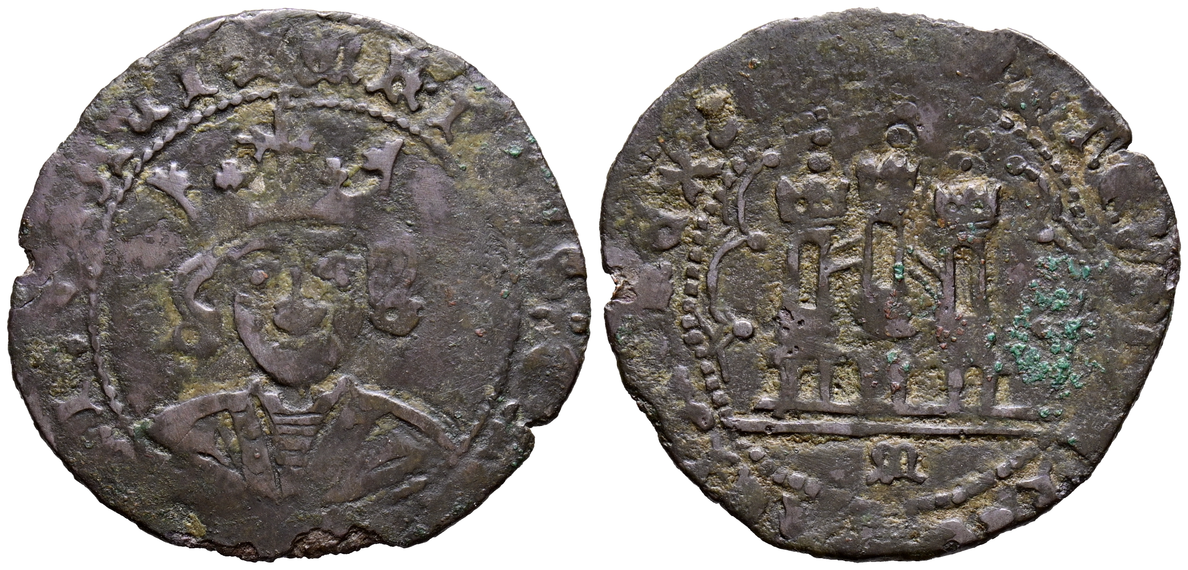 ENRIQUE IV (1454-1474). Cuartillo. (Ve. 2,69g/27mm). Murcia. (Imperatrix E4:14.108; FAB-749). Anv: Busto coronado de Enrique IV de frente, alrededor leyenda: ENRICVS CARTVS DEI GRA. Rev: Castillo, debajo: M gótica, todo dentro de gráfila polilobular, alrededor leyenda: ENRICVS DEI GRACIA REX. MBC-. Rara.