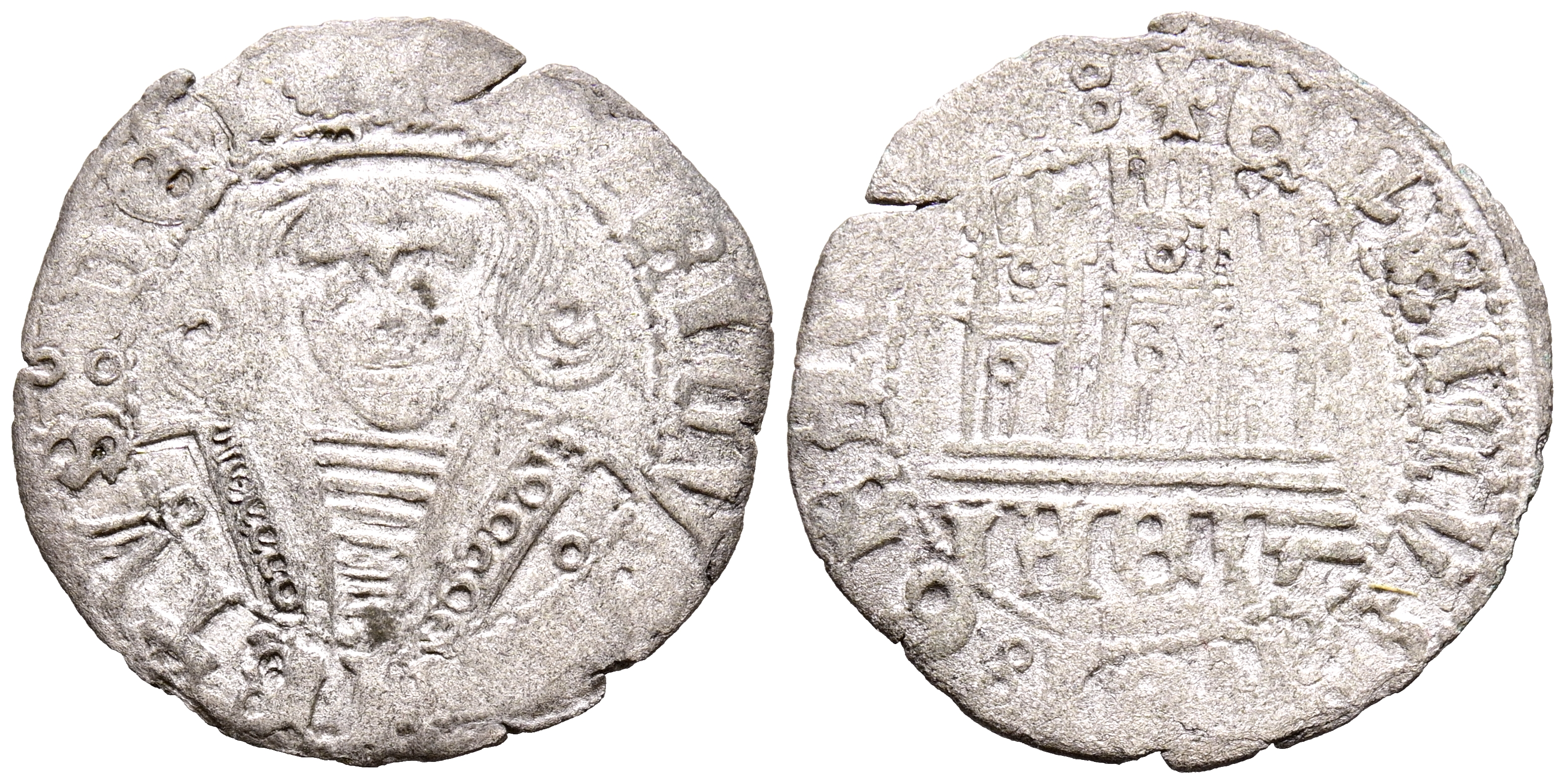 ENRIQUE IV (1454-1474). 1/2 Cuartillo. (Ve. 1,10g/22mm). Jaén. (Imperatrix E4:15.22; FAB-775). Anv: Busto coronado de Enrique IV de frente dentro de gráfila circular, alrededor leyenda: ENRICVS DEI GRACIA. Rev: Castillo, debajo: IAEN, todo dentro a una doble gráfila circular, alrededor leyenda: ENRICVS CARTVS REX. MBC.