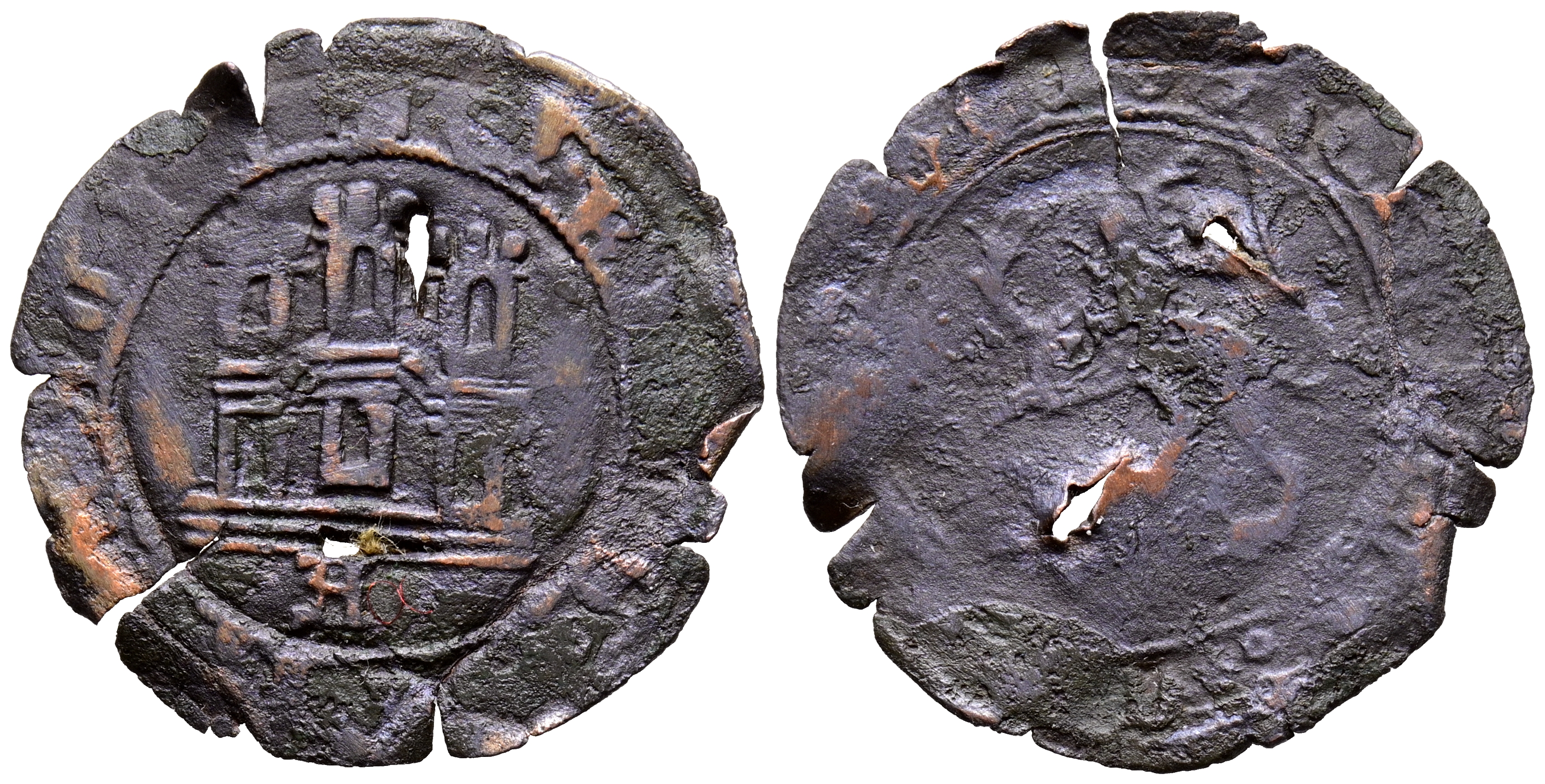 ENRIQUE IV (1454-1474). Maravedí. (Ve. 1,37g/24mm). Avila. (Imperatrix E4:20.1; FAB-790). Anv: Castillo, debajo: A, todo dentro de gráfila circular, alrededor leyenda: ENRICVS REX CASTELLE. Rev: León coronado y rampante a izquierda con granada a sus pies, todo dentro de gráfila circular, alrededor leyenda: ENRICVS CARTVS DEI G. BC+/BC-. Dos perforaciones. Rara.